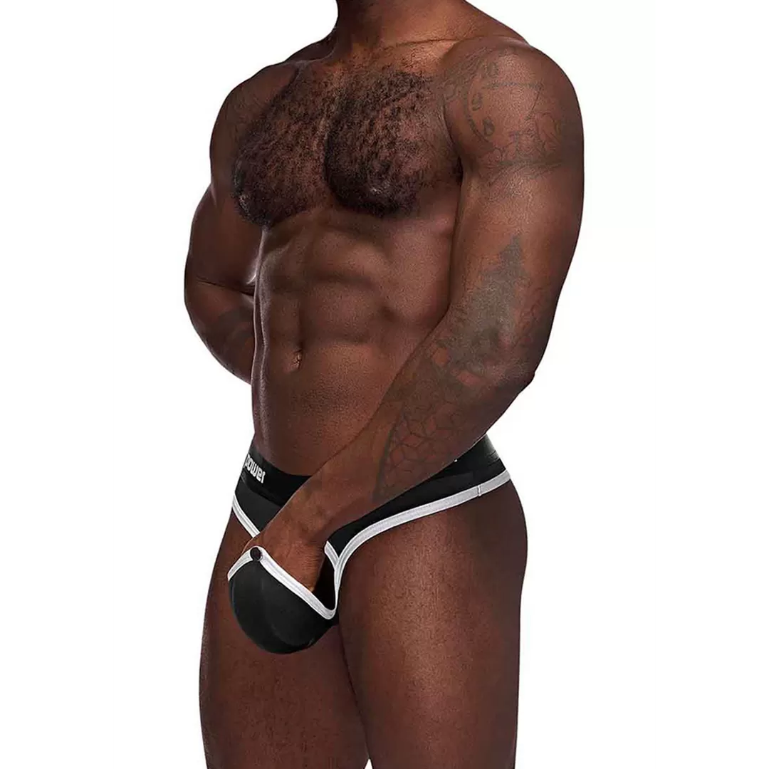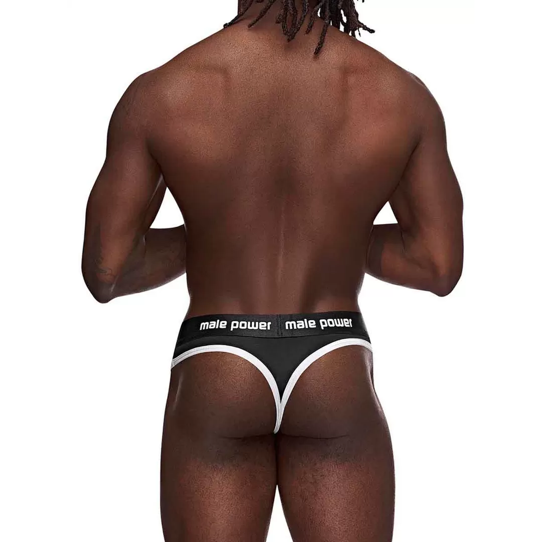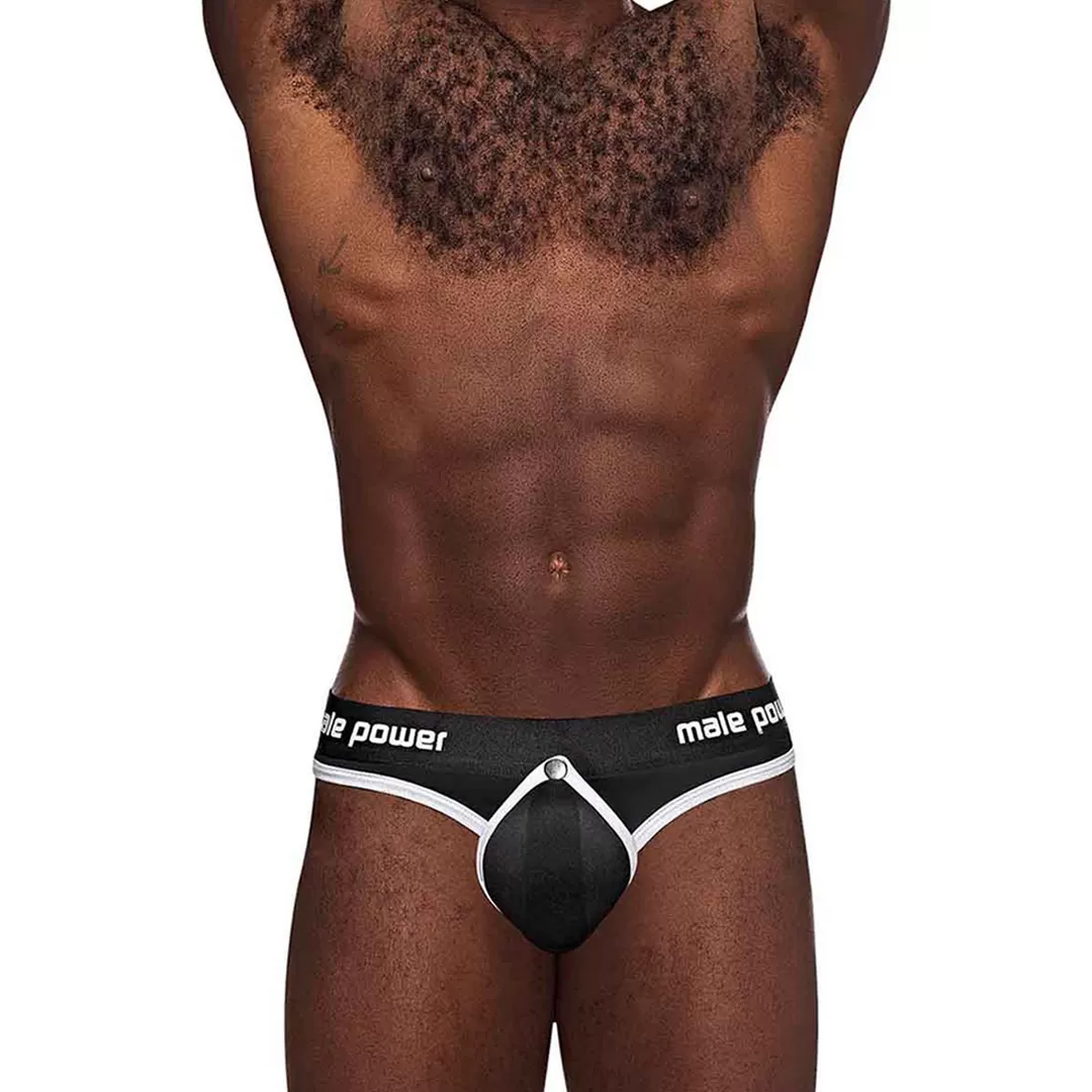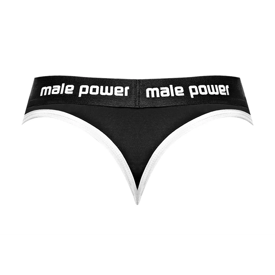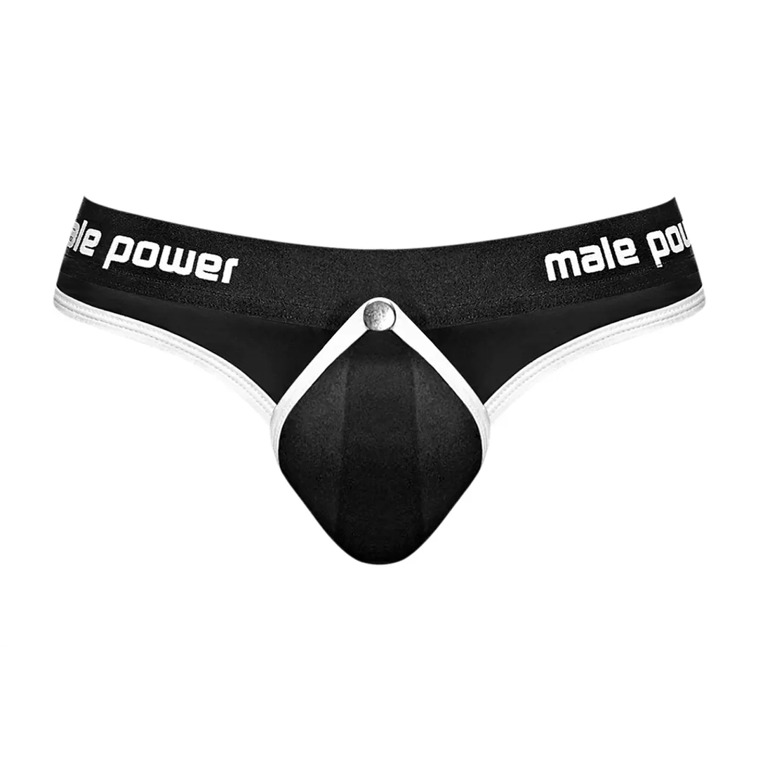Van de Helmet-collectie van Male Power, deze stijl omvat: Een string met een gevoerde pouch en een functionele bovenste drukknoop die een cirkelvormige uitsparing bedekt voor gemakkelijke toegang, en een merkgebonden satijnen tailleband.