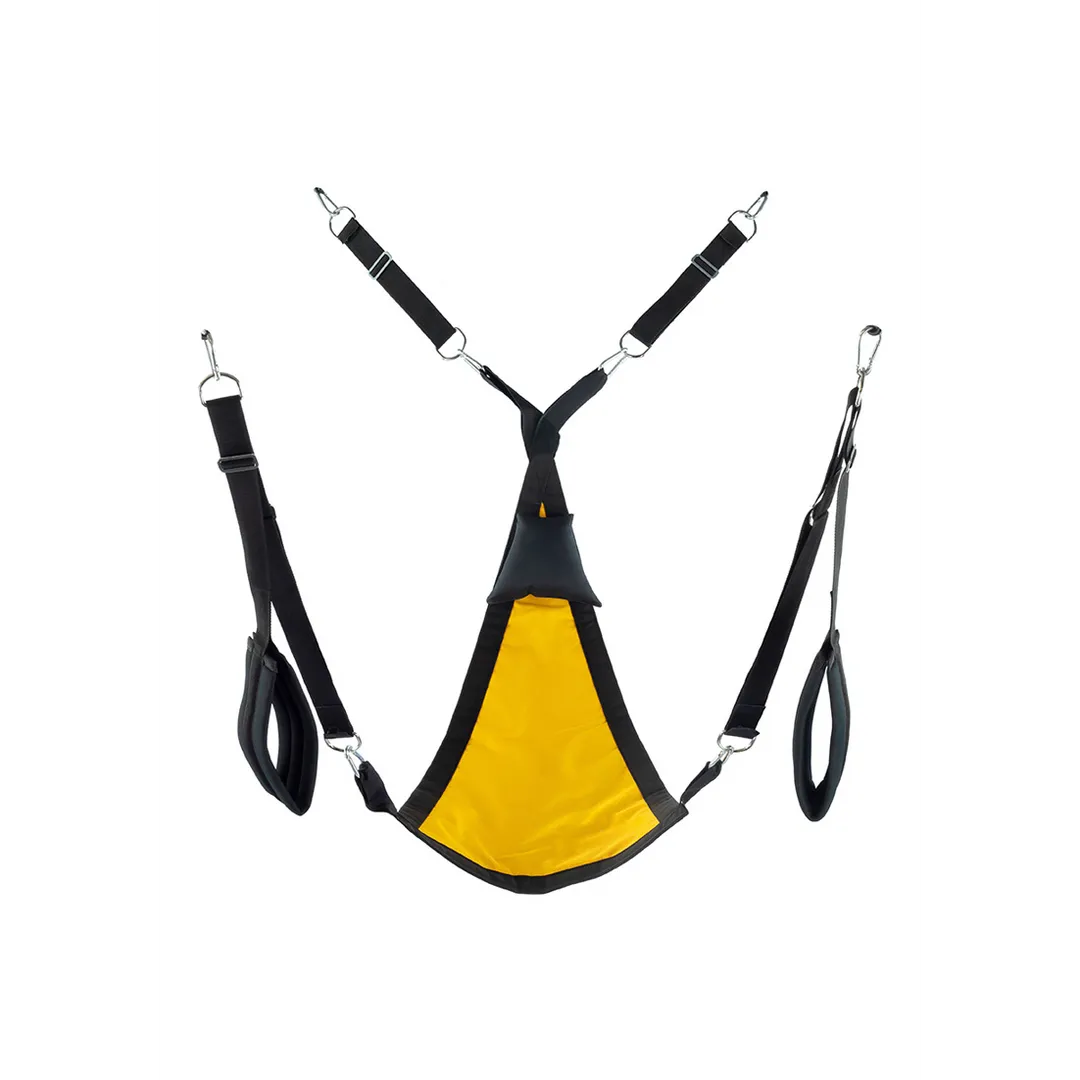 Deze gele stoffen sling is ontworpen met een driehoekige vorm en Camouflage stof. Hij past met 3 of 4 bevestigingspunten. Het wordt geleverd met de accessoires: de 4 hangers met de metalen karabijnhaken / de gewatteerde voetsteunen (11cm breed) / de zwarte driehoek kussen (24 x 20cm) Materiaal: polyester gemaakt in Europa