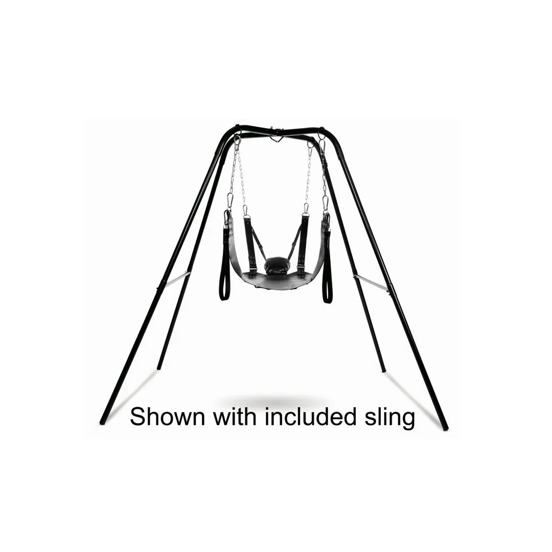 Deze kit is eenvoudig te monteren wanneer de stemming toeslaat, en bevat een stevige standaard, een mooie draagdoek en alle kettingen en clips die je nodig hebt voor comfortabele, kinky seks! Voorkom schade aan uw muren, deuren of plafond door uw sling in plaats daarvan op een standaard te hangen! Het unieke ontwerp heeft ingebouwde ringen om de karabijnhaken en kettingen stevig aan te bevestigen. De luxe met leer gevoerde sling biedt volledige toegang tot uw partner terwijl ze in de lucht hangen, opengespreid en op u wachten. Door het verstelbare ontwerp kunnen ze achterover leunen en hun voeten in de meegeleverde, maar verwijderbare stijgbeugels plaatsen. Het gewatteerde kussen zal hun hoofd wiegen, met verstelbare banden aan het hoofd waarmee je hun bovenlichaam omhoog of omlaag kunt brengen. Als je klaar bent, veegt de schommel snel af en de standaard kan gemakkelijk worden gedemonteerd voor discrete opslag.