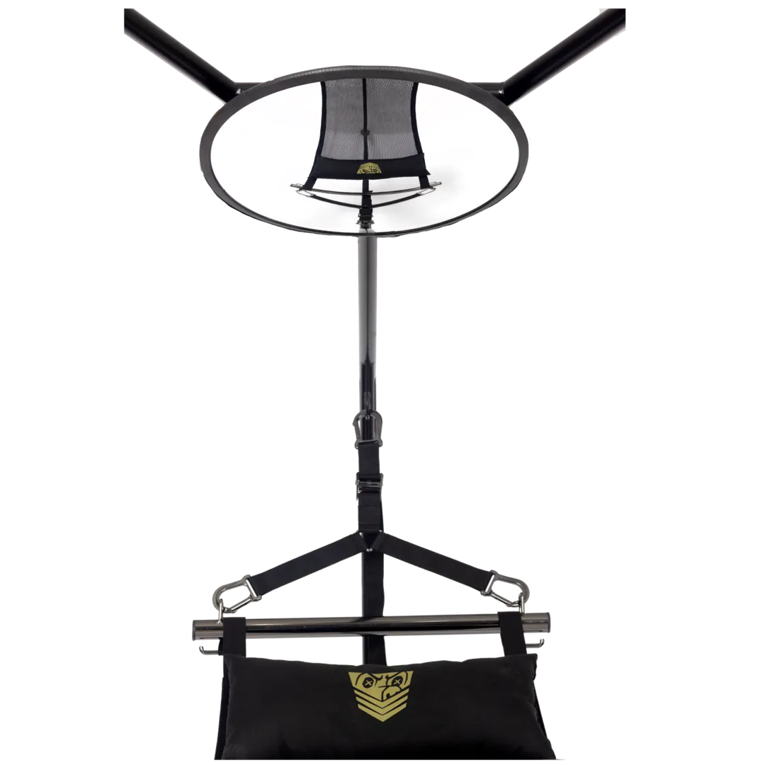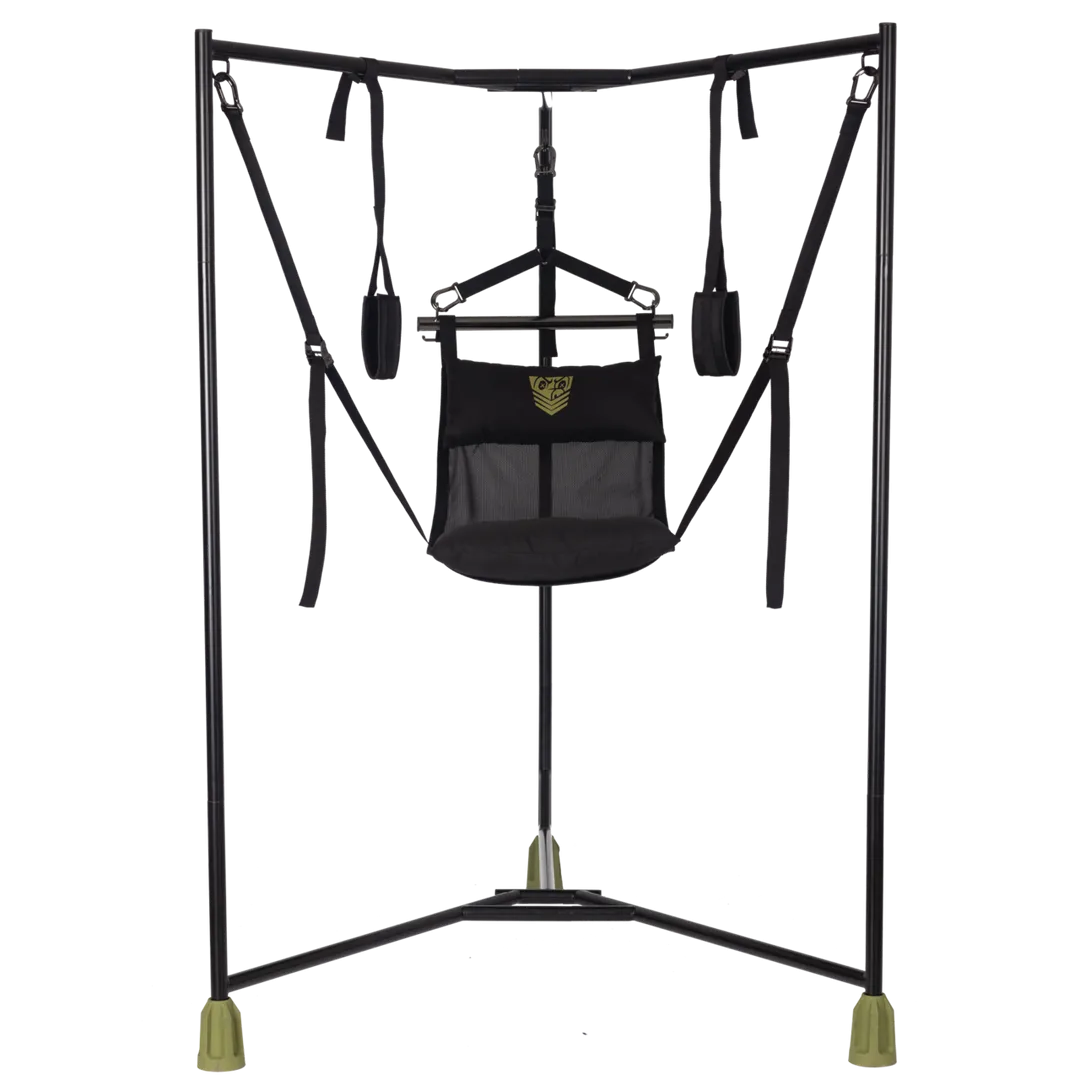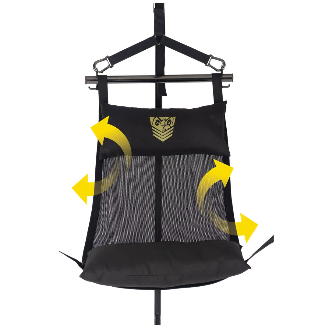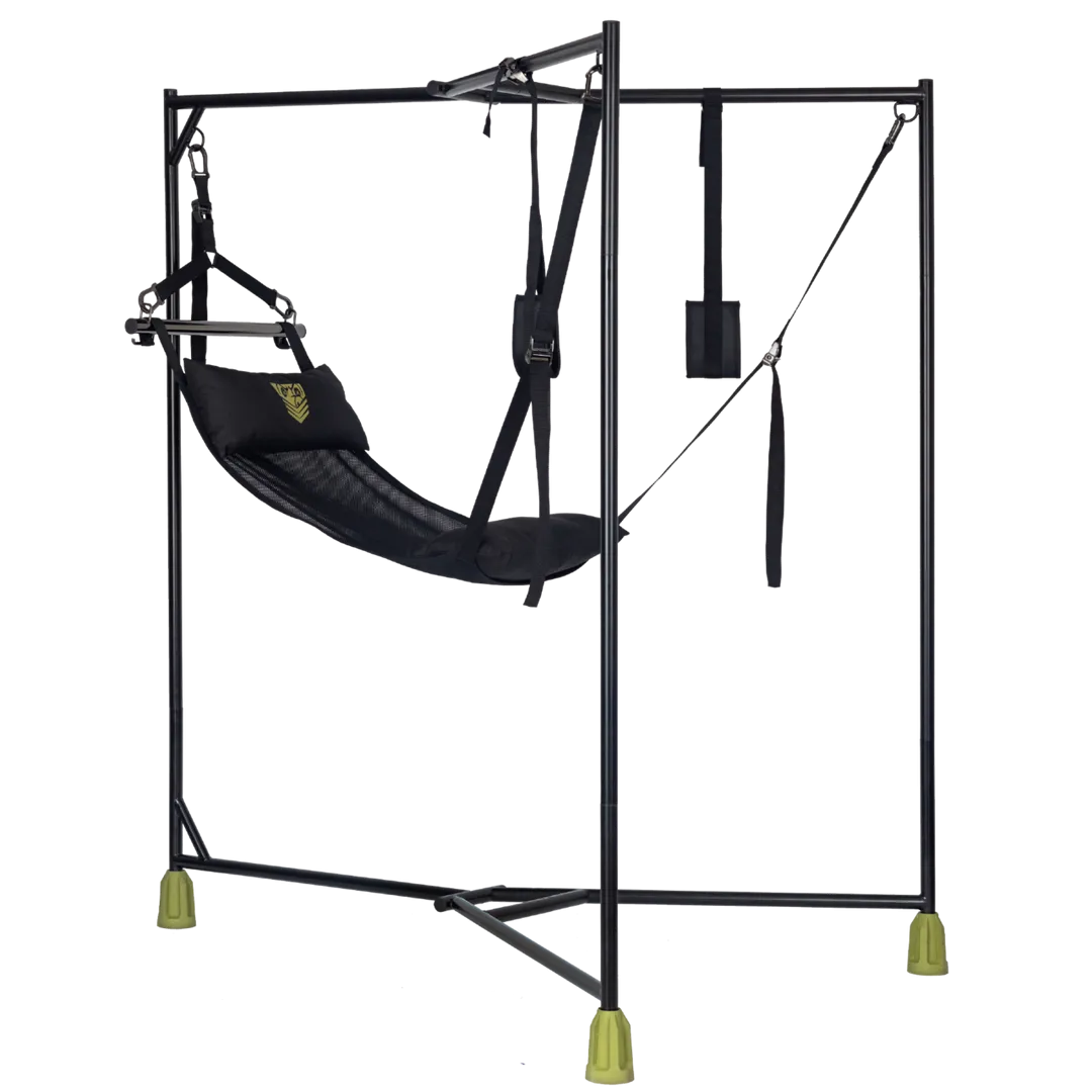 Sling play verslaat bed bangin' ELKE dag. Ga met je benen omhoog, volledig ondersteund, in pure BLISS. Start deze E-ticket rit met onze FT Hammock Hangar. Het begint allemaal met het MEEST stabiele Frame ooit gebouwd. De FT Unibar verticale supports zijn NAADLOOS... een onderscheidend punt ten opzichte van andere sling frames. Deze éénstukconstructie biedt ONGEëvenaarde stabiliteit. Ons Interlock ontwerp, aan de boven- en onderkant, zorgt voor KERN veerkrachtige sterkte. Rijd op een frame dat is verankerd met 3 zeker geplaatste BIG BOOT grips. Ervaar een rotsvaste rit... met GEEN afleidingen. Nestel in onze revolutionaire MESH hangmat voor maximaal comfort. Het open-weave ontwerp BREEKT voor langdurig comfort. Je wordt ondersteund met TWEE ballistische nylon kussens. FT Hammock Hangar is uitgerust met oneindig verstelbare nylon banden + stijgbeugels. In tegenstelling tot conventionele kettingsteunen, leveren deze stille helpers een klankvrije rit. Ze passen zich binnen enkele seconden aan de perfecte positie aan. Met het unieke tri-leg ontwerp werkt Hammock Hangar in de krapste barakken. Het nestelt perfect in hoeken en vereist slechts 12,5 vierkante voet (1,2 m2 vierkante meters) ruimte. Het wordt binnen enkele minuten gemonteerd zonder benodigde gereedschappen. De hangmat en stijgbeugels kunnen worden verwijderd voor machinewas. Ga TACTISCH... voeg nieuwe tools toe aan je Hammock Hangar. De Special Ops spiegel voegt visuele eye candy toe voor de sub. De Provision Pod houdt je lube en papieren handdoeken binnen handbereik. Bevestig onze FT Gunner Fuck Machine met de bijpassende mount en cruise SOLO.