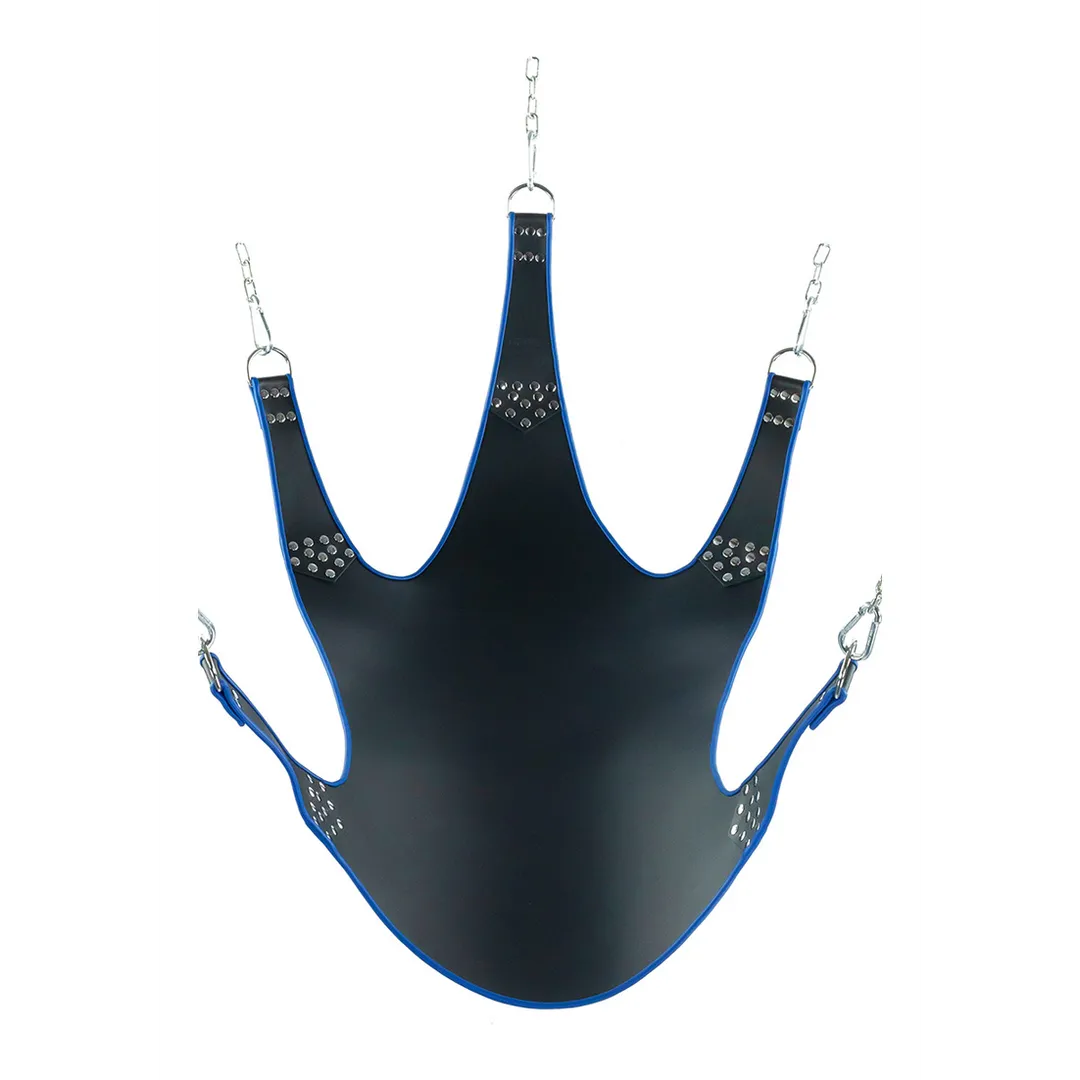 Zwart lederen elegante draagdoek met blauwe bies voor een zeer trendy stijl. Hij is ontworpen met 5 bevestigingspunten. Afmetingen 113 x 122cm. Fijn en duurzaam echt lederen materiaal. Hoge kwaliteit. Plantaardig gelooid. Gemaakt in Europa.