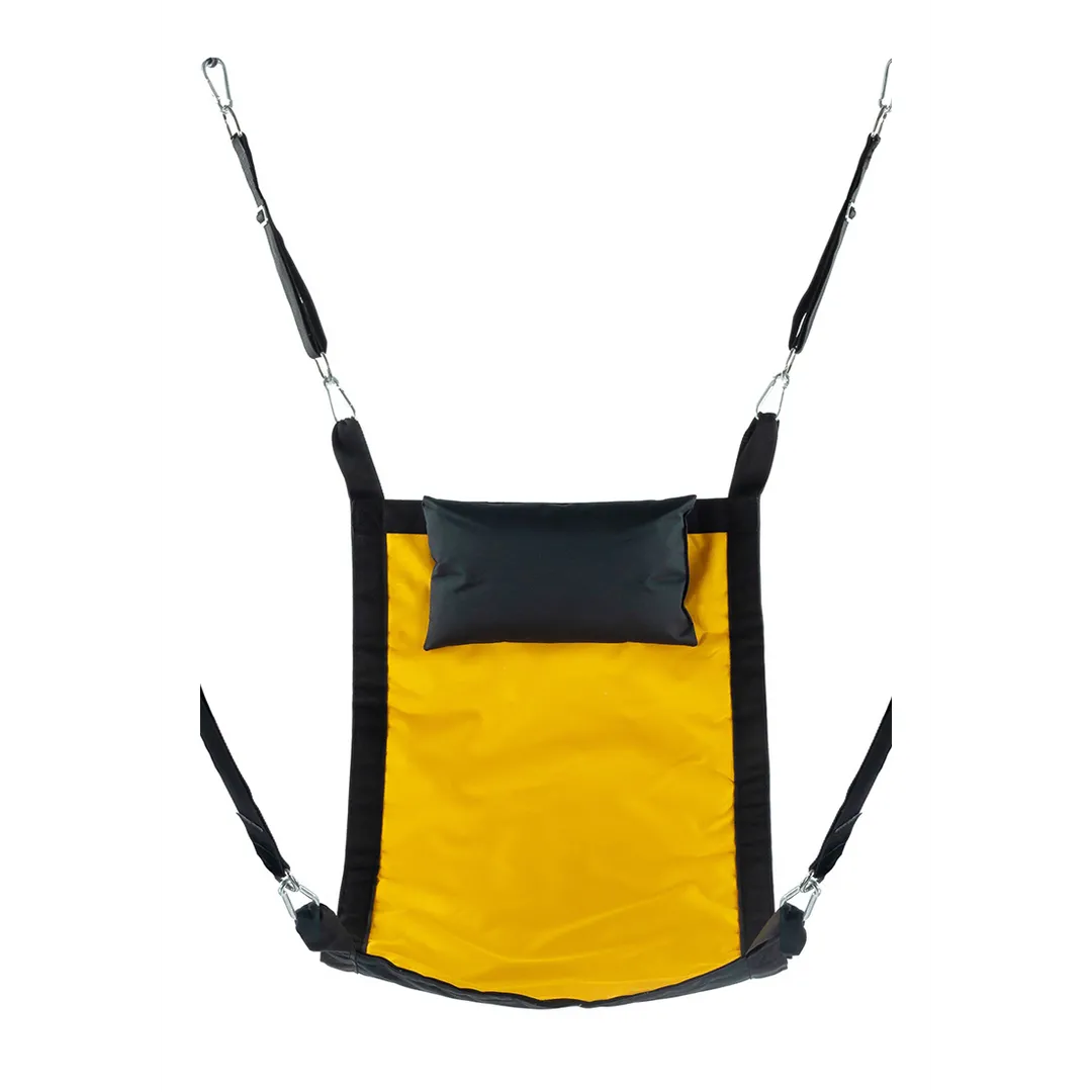 Hier is een gele stoffen draagdoek met alle toebehoren: de hangers met de metalen karabijnhaken / de gewatteerde voetsteunen (11cm breed) / het kussen (23 x 38cm). De sling is rechthoekig van vorm. Materiaal: polyester. Met de opbergtas