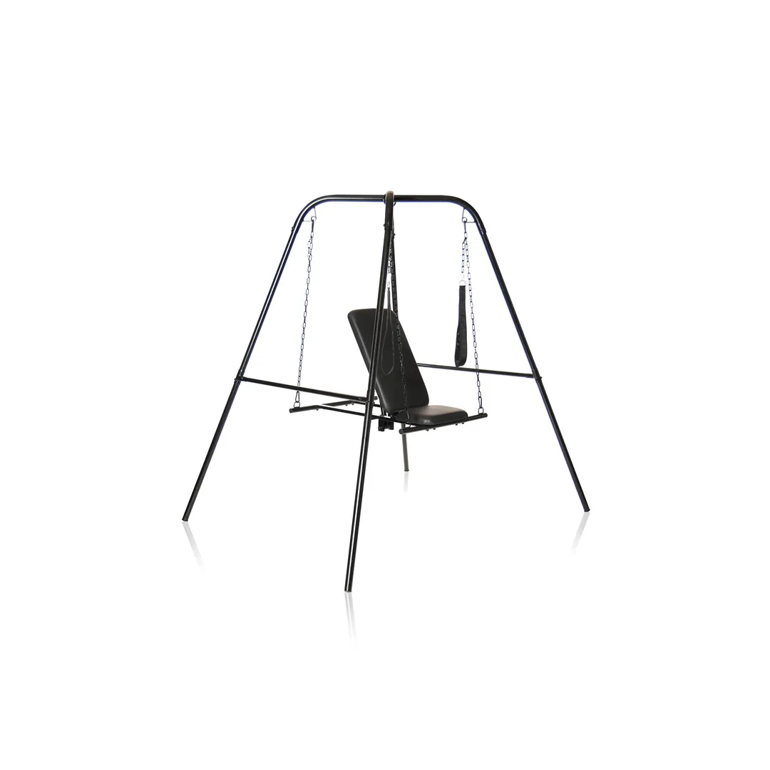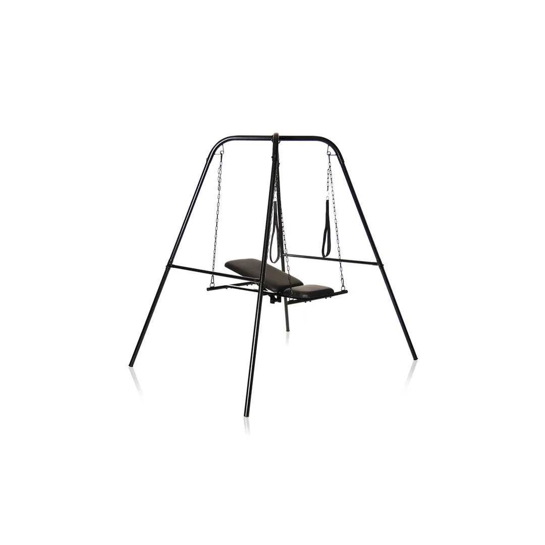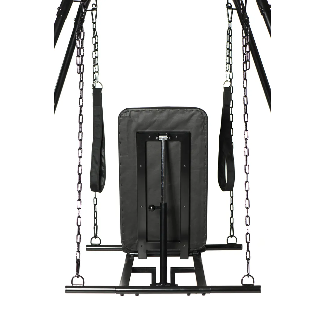 Deze sling is anders dan andere. Voor degenen die ondersteuning willen en een gevoerde maar stevige ondergrond, is deze sling een zwevende stoel of bondage tafel die je ervaring gewichtloos maakt. Terwijl je de zwaartekracht tart en de grenzen van je ondeugende comfortzone verkent in intense of stimulerende scènes, bevind je je veilig boven de grond op deze stoel sling, opgehangen aan een duurzaam stalen frame dat tot 150 kg kan dragen. De stoel hangt via kettingen aan het eenvoudig te monteren frame. Beugels zijn inbegrepen en stellen je in staat om je benen te verhogen of je handen vast te pakken, afhankelijk van je positie. Stel de hoogte volledig in zodat je partner kan genieten van ergonomische penetratie en spel! Pas de hoek van de stoel aan van 90 graden tot 180 graden om van rechtop zitten naar achterover liggen te gaan en ontdek welke hoek je de perfecte hoek geeft om je A-spot, G-spot of P-spot te raken! De comfortabele, gevoerde stoel is bedekt met vegan-vriendelijk, gemakkelijk te reinigen PU-leer. Zet de sling en standaard op. Als jij degene bent die zal staan terwijl je het gebruikt, zorg er dan voor dat het zo is ingesteld dat de stoel op heuphoogte is voor optimale toegang tot penetratie. Voor handmatige penetratie ga in een lunges en verbreed je houding voor de beste krachtpositie. Help je partner dan om in de stoel te komen. Ze kunnen hun benen in de beugels plaatsen en je kunt ze laten zitten of achterover laten liggen in de hoek van jouw keuze. Zodra je ze in de stoel hebt, kun je nu genieten van gemakkelijke penetratie! Pak de stoel vast en wieg deze heen en weer tegen je met elke duw. Houd ze op hun plaats en bereik hun zoete plek gemakkelijk. Ga op hen zitten of speel met hun tepels, erogene zones en meer! Als je ze achterover laat liggen, kunnen ze je ook orale bevrediging geven! Veel plezier en geniet van de rit! Afmetingen: (LxBxD= 208 x 216 x 216 cm) STANDAARD: 82 inch. Geassembleerde hoogte 85 inch x 58 inch basisoppervlak. SLING: Frame meet 39,5 inch lengte x 31 inch breedte. Zitting meet 11 inch lengte x 15,5 inch breedte. Rugleuning meet 27,5 inch lengte x 15,75 inch breedte leunt van 90° tot 180°. KETTINGEN: 46 inch lengte BEUGELS: 20 inch lengte Maximaal gewichtslimiet: 150 kg Materialen: IJzer, PU-leer Kleur: Zwart, metaal Opmerking: Alle gereedschappen en instructies inbegrepen Belangrijkste kenmerken: Duurzaam Frame: Gemaakt van duurzaam staal kan dit frame tot 150 kg aan. Verstelbare Hoogte: Pas de hoogte aan zodat je een ergonomische opstelling hebt voor allerlei ondeugende plezier! Verstelbare Sling: Ga van 90 tot 180 graden zodat je het zittend of achterover liggend kunt genieten. Comfortabele PU-leer Pads: De twee delen van de slingstoel zijn gevoerd en bedekt met vegan-vriendelijk PU-leer.