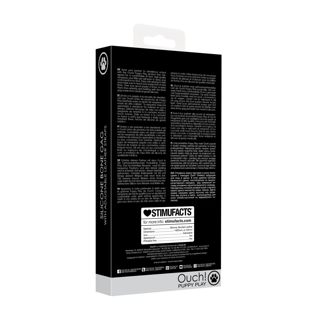 Enjoy role playing in style and make sure to teach your puppy lots of new tricks.Send your partner to obedience school with the Ouch! Puppy Play product line.Give your good puppy a bone or keep them from whining and barking with the Bone gag made from medical grade silicone.Bone gag with an adjustable band/
