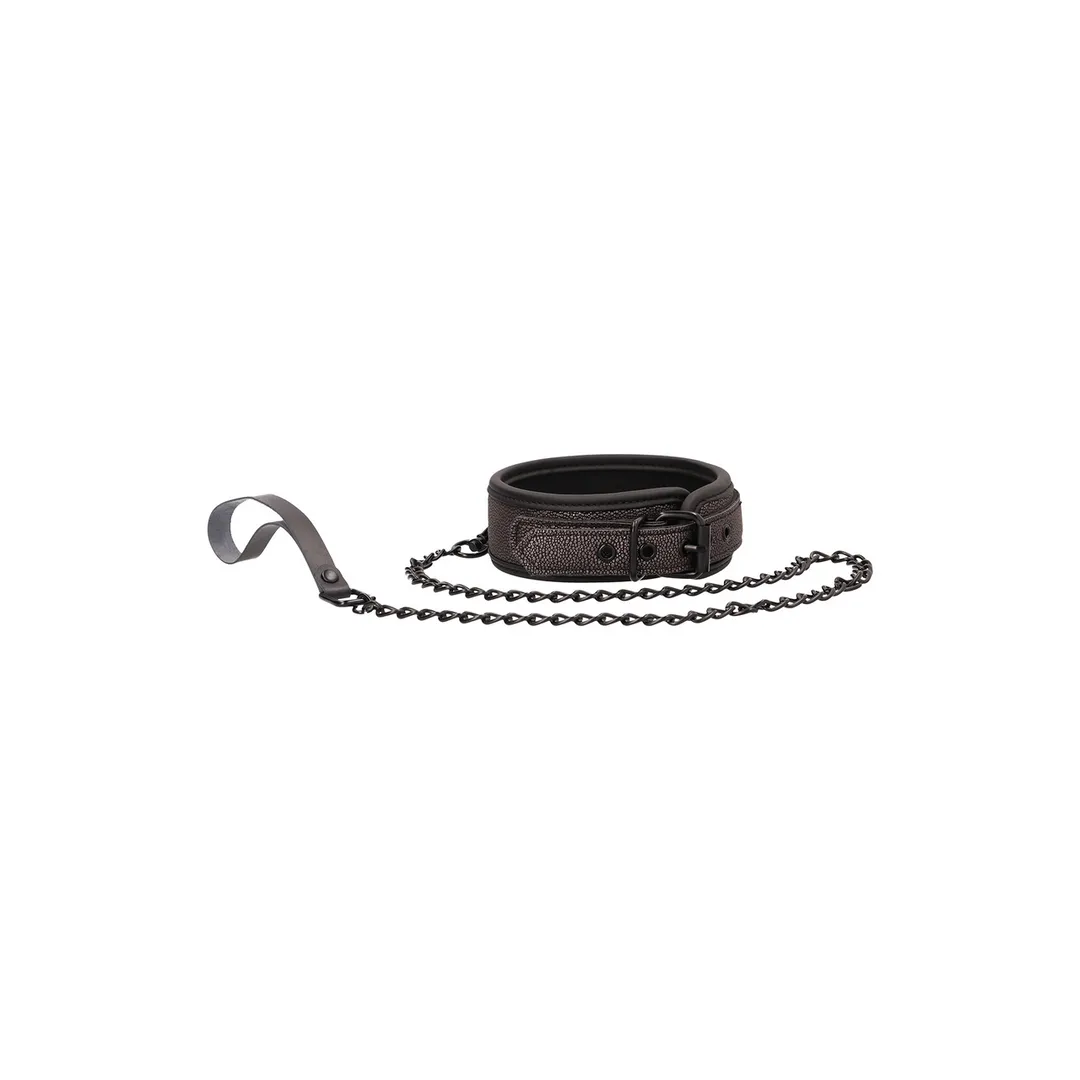 Met deze comfortabele en stevige halsband met riem heb je de totale controle! Uitgevoerd in stijlvol titaniumgrijs en gemaakt van gebonden leder, neopreen, pvc en aluminium, heeft de riem een lengte van 97 cm.
