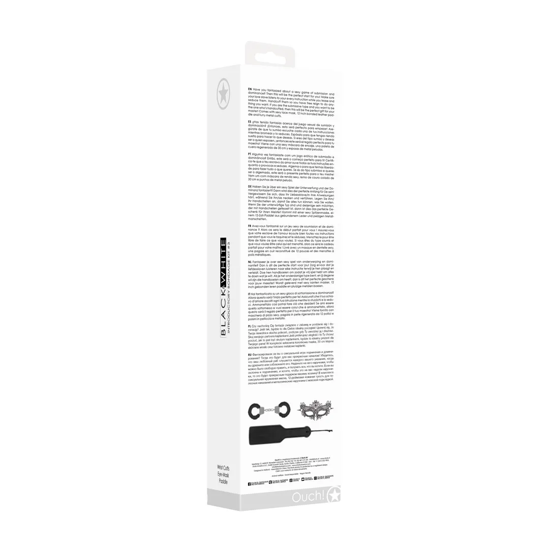 Perfect bondage kit for beginnersThe box contains everything you need for teasing your partner or more extreme roleplayThis kit is only available in BlackComes with an sexy lace mask, 12 leather paddle and furry metal cuffs/