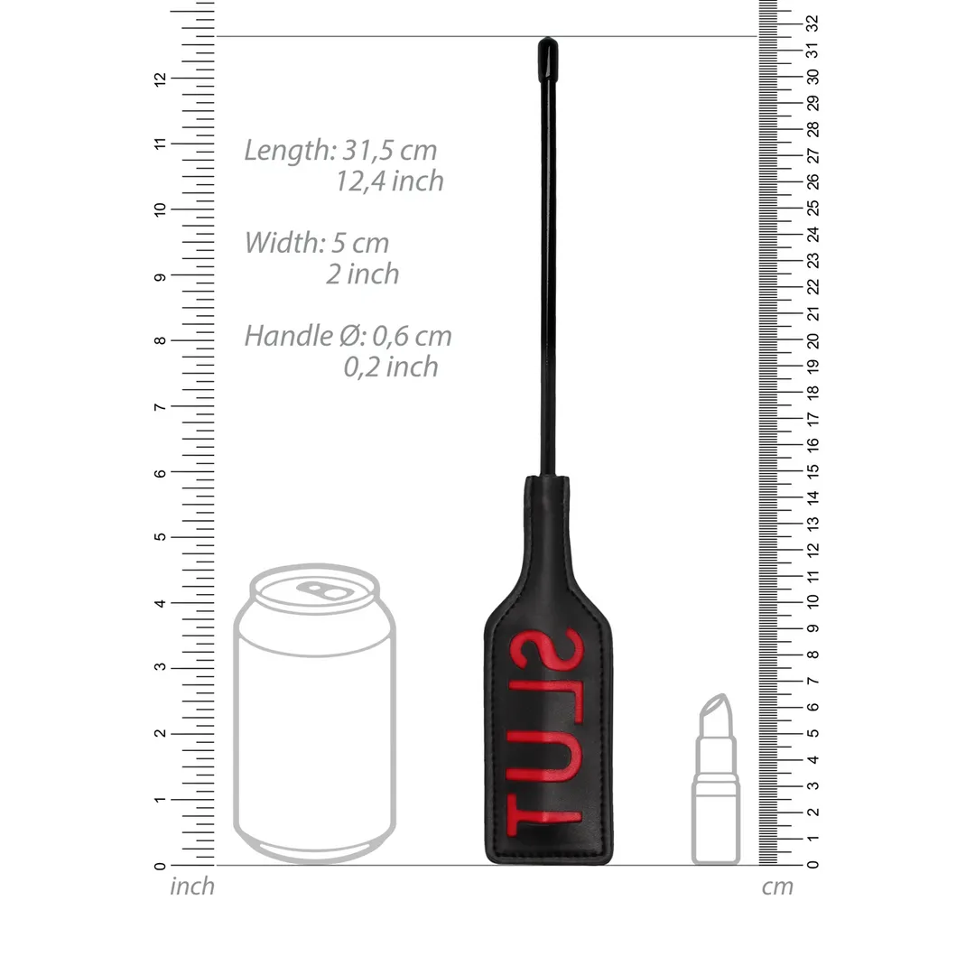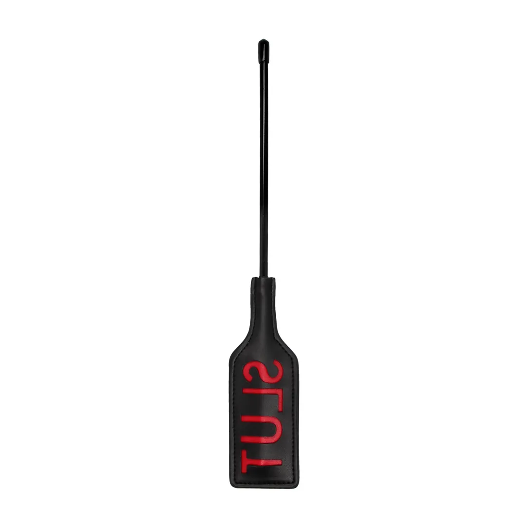 Leave a lasting impression on your partner. This short handled rectangular shaped crop is the perfect way to discipline your partner. Leave a lasting impression on your sub. The word SLUT is reversed so it will show up on their skin