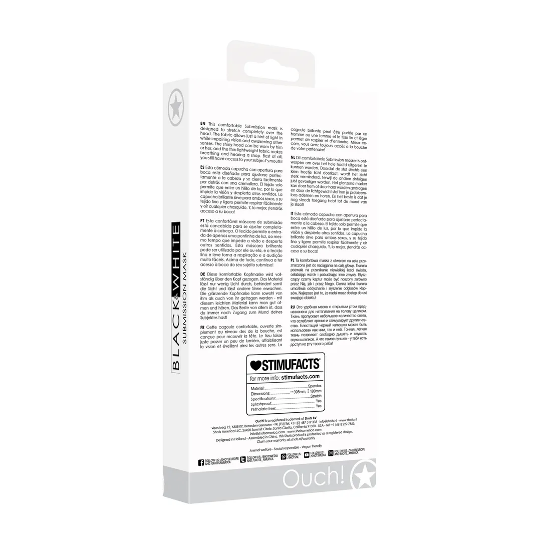 Dit comfortabele Submission masker is ontworpen om over het hele hoofd uitgerekt te kunnen worden. Doordat de stof slechts een klein beetje licht door- laat, wordt het zicht sterk verminderd, terwijl de an- dere zintuigen juist gevoeliger worden. Het glanzend masker kan door hem of door haar worden gedra- gen en door de lichtgewicht stof kun je probleemloos ademen en horen. En het beste is dat je nog steeds toegang hebt tot de mond van je slaaf!