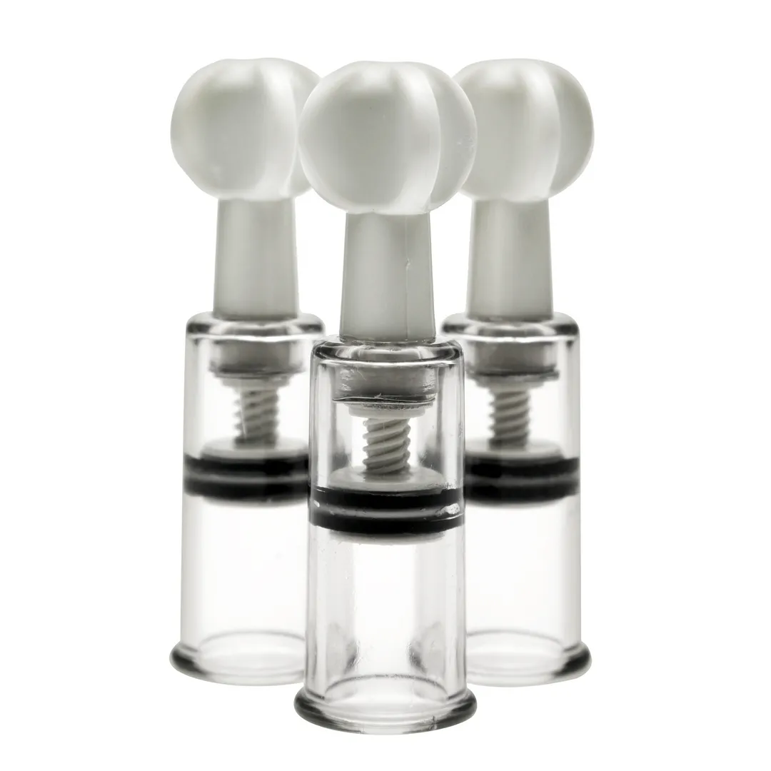 Geniet van krachtige zuigkracht met deze drievoudige set van bescheiden geconfigureerde zuigcilinders. Breng ze eenvoudig aan op elk gebied dat baat heeft bij verhoogde gevoeligheid en bloeddoorstroming, zonder pompen of accessoires. Deze zelfvoorzienende zuigapparaten werken met een eenvoudige draai. Stil, eenvoudig en discreet, deze zuigers kunnen praktisch overal mee naartoe worden genomen voor stimulatie onderweg. Van binnen gelubriceerd voor soepele beweging en een sterke afsluiting die zorgt voor subliem krachtige zuigkracht. Afmetingen: Opening heeft een diameter van 0,75 inch, de buis is 2,35 inch lang en het gehele item is 4 inch lang. Materiaal: ABS kunststof Kleur: Doorzichtig