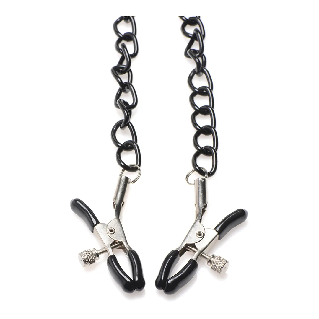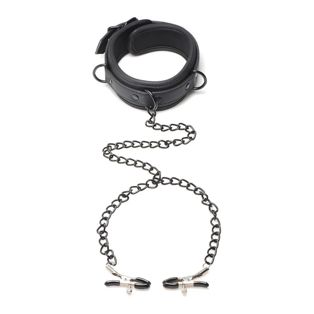 Geniet ervan om je onderdanige geliefde om te toveren tot een Collared Temptress met deze neopreen halsband met zwarte kettingen verbonden aan verstelbare tepelklemmen! De halsband zelf heeft zwarte gespen voor een volledig verstelbare pasvorm en 3 D-ringen om accessoires of kettingen en boeien aan te bevestigen. De centrale D-ring heeft al zwarte kettingen die splitsen in twee kettingen, elk met een tepelklem aan het einde. Elke tepelklem heeft een rubberen punt om het gevoelige huidweefsel te beschermen en een kleine schroef voor nauwkeurige drukaanpassingen. Al het metaal is nikkelvrij. Laat je geliefde voor je knielen terwijl je hun halsband om hun nek plaatst. De gespen klikken vast en je zorgt ervoor dat de halsband snug en comfortabel zit, zodat ze de zachte, gevoerde en gladde textuur van het neopreen kunnen voelen. Je pakt de ketting in het midden van hun keel en trekt ze voorzichtig naar je toe, waardoor ze hun borst omhoog tillen. Terwijl je hun tepel in je vrije hand neemt, neem je de klem en plaats je deze langzaam achter de tepel, op de areola, en pas je de druk aan met de kleine schroef. Terwijl je hetzelfde doet op de andere tepel, hoor je de adem van je geliefde in hun keel steken en gaspende geluiden maken terwijl ze beginnen pijn en genot te mengen, en alles ervaren onder jouw handen. Om schoon te maken, spuit je eenvoudig met een speelgoedreiniger en veeg je droog. Afmetingen: Halsband past van 32 cm tot 40 cm omtrek, Kettinglengte: 56 cm, Tepelklemmen openen tot 1,3 cm breed Materialen: Neopreen, metaal, rubber Kleur: Zwart, Zilver Belangrijkste Kenmerken: Verstelbare Halsband en Klemmen: De neopreen halsband heeft zwarte, metalen gespen die kunnen worden aangetrokken of losgemaakt voor jouw comfort. De klemmen zijn verstelbaar via de metalen schroef zodat je ze kunt aanspannen en losmaken voor een exacte pasvorm. D-Ringen voor Bevestigingen: Bevestig accessoires of meer kettingen aan een van de 3 D-ringen op de halsband. De centrale D-ring heeft een enkele ketting die vervolgens splits in twee aparte kettingen en aan elke tepel wordt bevestigd via de klemmen. Zacht en Comfortabel: De halsband zelf is comfortabel om te dragen en zacht tegen de huid met een gladde textuur en padding. Nikkelvrij Metaal: Al het metaal is nikkelvrij en veilig voor het lichaam.