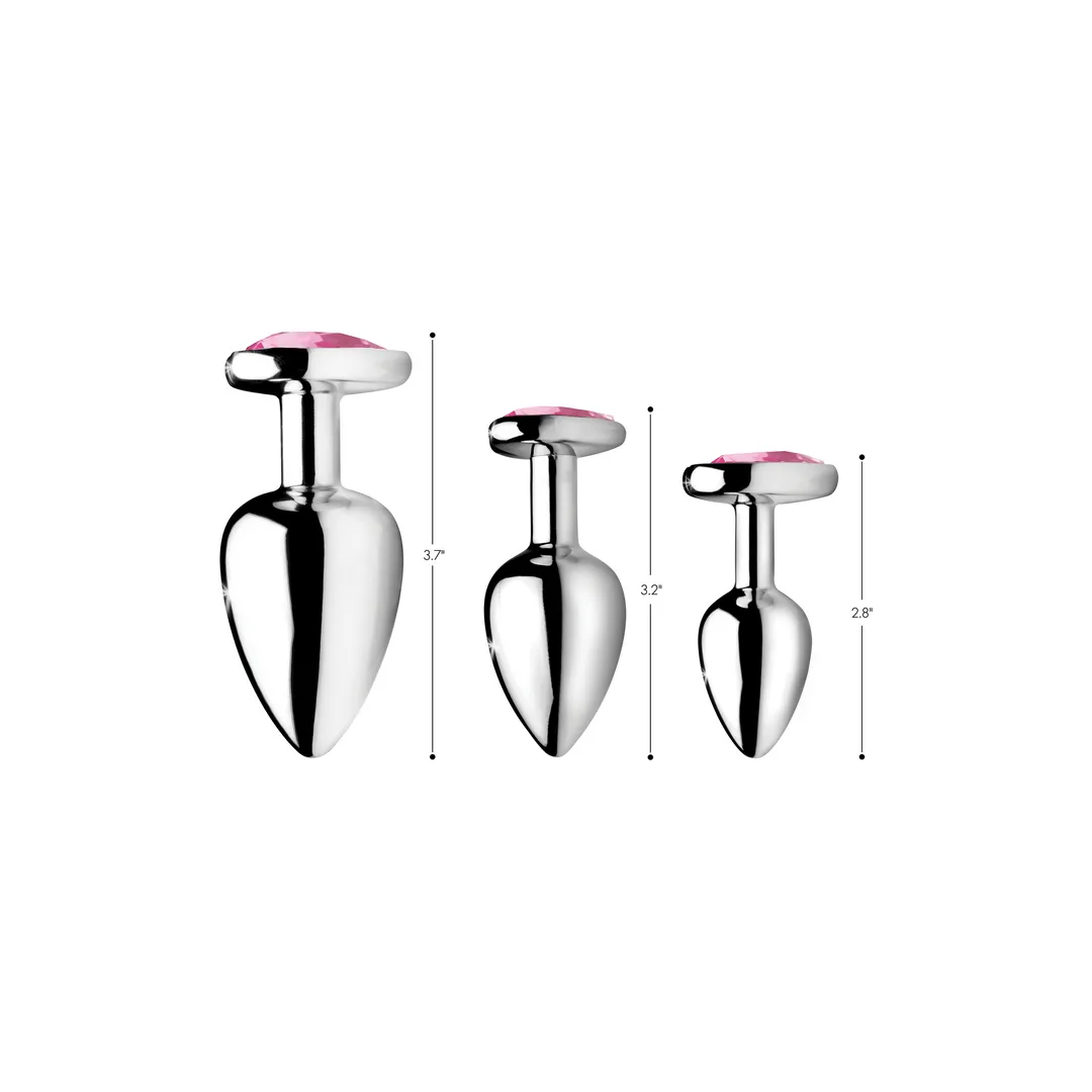 Als er liefde in de lucht hangt, versier dan je derriere! Deze hartvormige pluggen zijn tegelijkertijd lief en sexy. Met drie verschillende plugformaten kun je anaal spelen in je eigen tempo, of kiezen op basis van waar je zin in hebt! Steek elke slanke plug erin om het comfortabele gewicht in je lichaam te waarderen, dankzij het nikkelvrije materiaal van aluminiumlegering. Geweldig voor temperatuurspel, je kunt ze opwarmen of afkoelen in water voordat je ze inbrengt. De sprankelende charme aan de basis zal een romantische en opwindende verrassing zijn voor je partner als je voorover buigt. Gebruik met een smeermiddel naar keuze en reinig na gebruik met milde zeep of speelgoedreiniger. Afmetingen: Kleine plug is 2,6 inch in totale lengte, 2,4 inch insteekbare lengte, 1 inch bij breedste diameter, 0,4 inch in diameter bij steel. Medium plug is 3,2 inch in totale lengte, 3 inch insteekbare lengte, 1,3 inch bij breedste diameter, 0,45 inch in diameter bij steel. Grote plug is 3,8 inch in totale lengte, 3,4 inch insteekbare lengte, 1,6 inch bij breedste diameter, 0,48 inch in diameter bij steel.