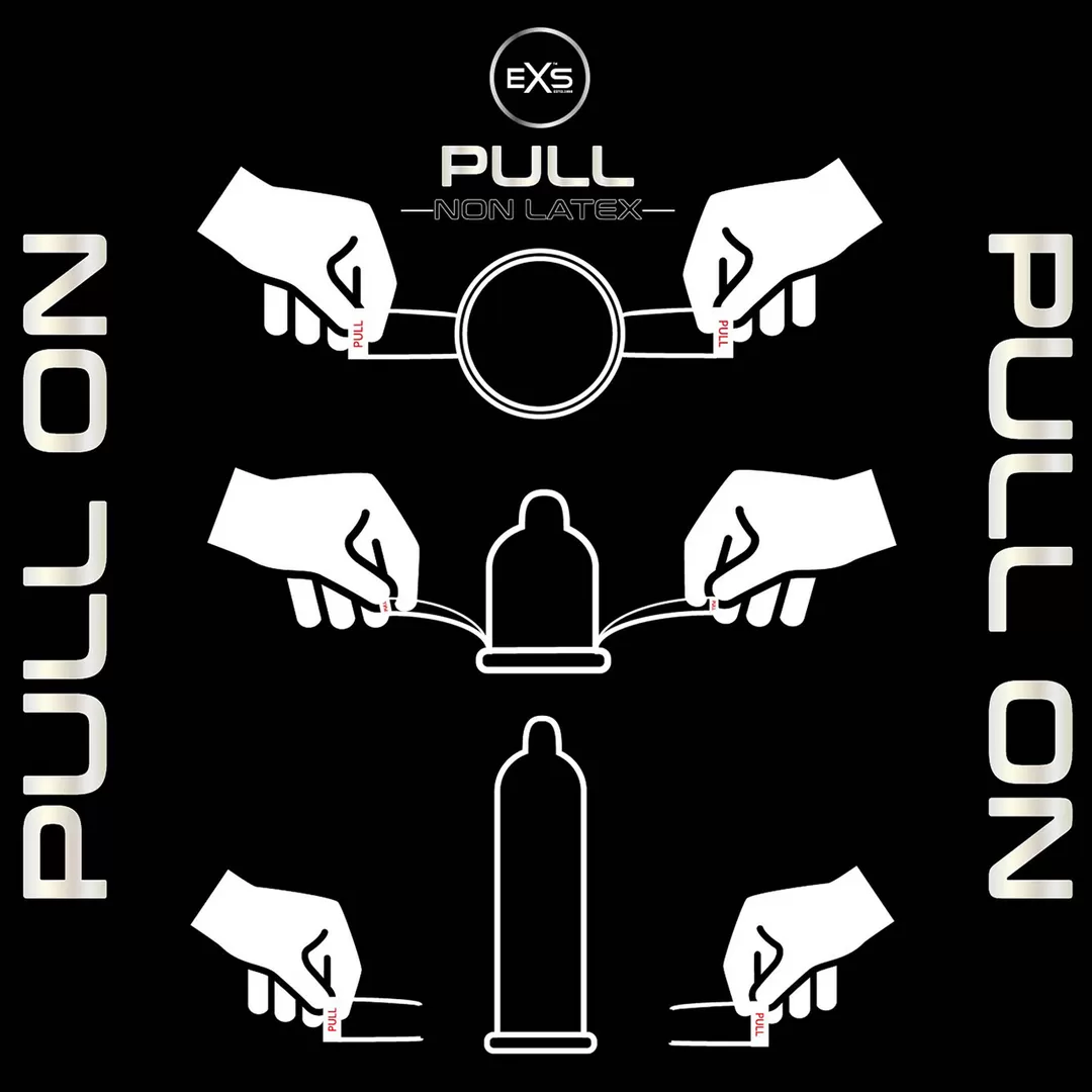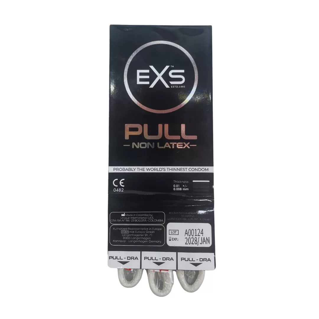 Introducing the next generation latex-free condoms: EXS Pull. The THINNEST condom in the EXS range and probably the thinnest condom in the world at an incredible 0.008mm thickness. Made from hypoallergenic (non-allergy) material called AT-10 high-performance resinFeaturing the revolutionary easy put on 'Strip System' Technology. The helpful straps effortlessly PULL down the condom for a fast and secure application. /