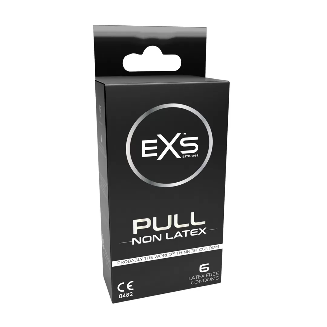 Introducing the next generation latex-free condoms: EXS Pull. The THINNEST condom in the EXS range and probably the thinnest condom in the world at an incredible 0.008mm thickness. Made from hypoallergenic (non-allergy) material called AT-10 high-performance resinFeaturing the revolutionary easy put on 'Strip System' Technology. The helpful straps effortlessly PULL down the condom for a fast and secure application. /