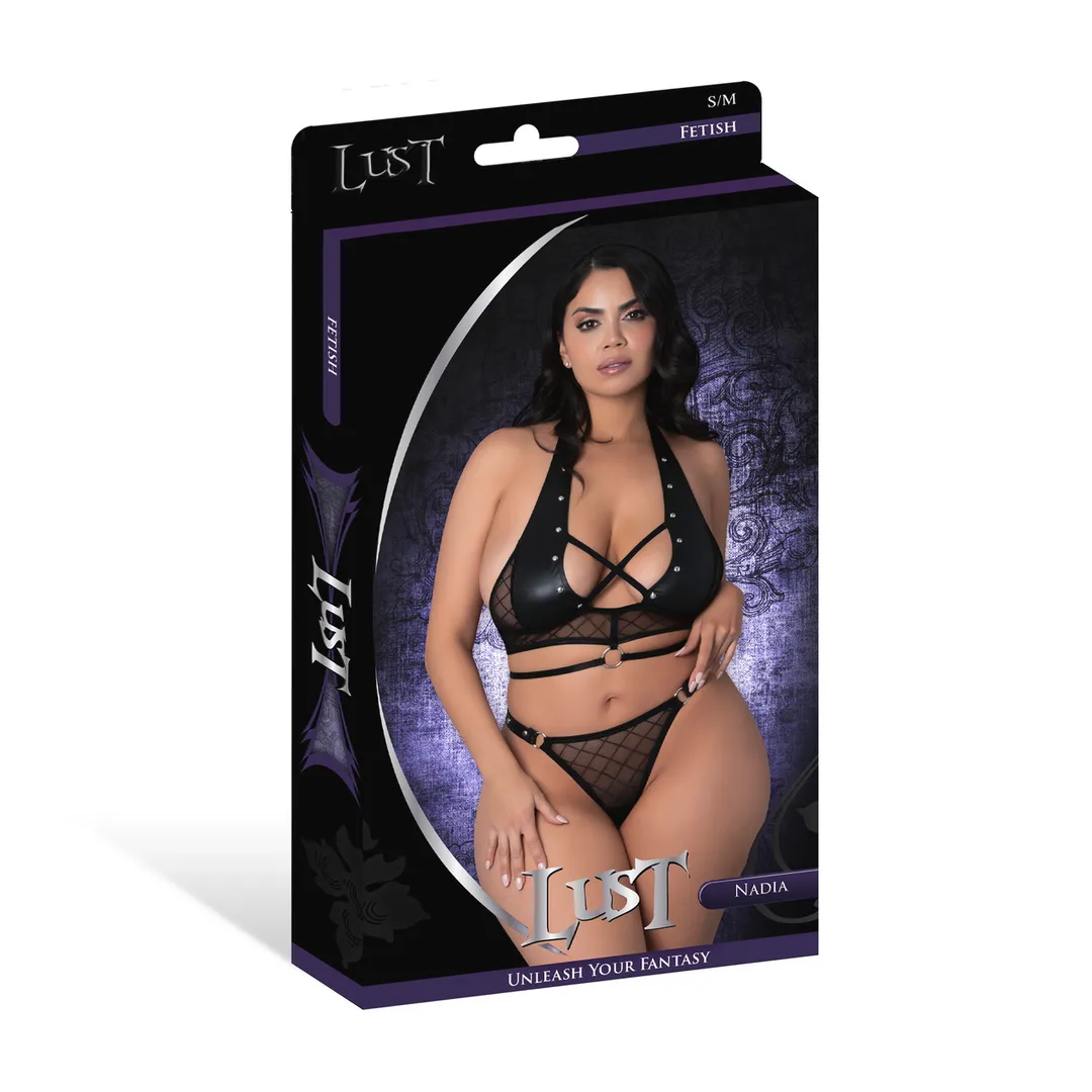 From the Lust Fetish collection by Magic Silk, this style includes: a halter top featuring satin elastic straps, rings and studs, a ring thong with high-cut legs. Made from stretch poly spandex diamond mesh and cire for a shiny, faux leather finish. Finished with nickel-plated metal rings, clasps, and studs for an edgy touch.