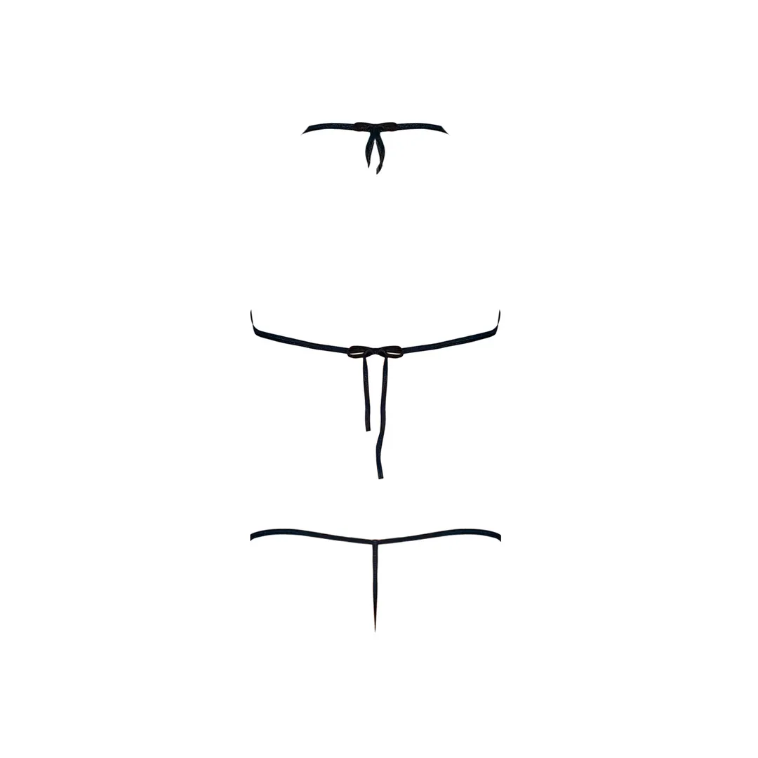 Van de Exposed by Magic Silk-collectie, deze stijl omvat: Een halterbh met bandjes, voorzien van zachte, vormbehoudende elastiek en strikjes rond de nek en rug voor sluiting, en een bijpassende strappy G-string.