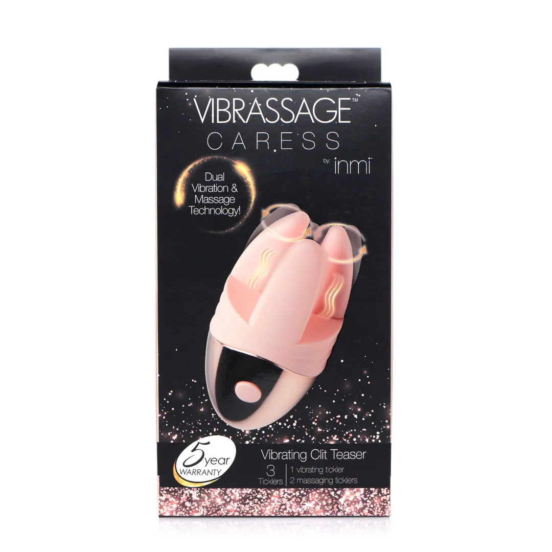 Deze vibrerende clitoris teaser maakt gebruik van dubbele vibratie- en massagetechnologie om je gevoelige clitoris - of andere erogene zones - te omringen met krachtig gezoem van de ene kietel en zacht ronddraaien van de andere twee. De Vibrassage Caress is het oplaadbare en luxe seksaccessoire dat je lichaam verdient, en past gemakkelijk in je hand tijdens solo- of partnerspel om je clitoris te richten voor puur plezier. Hij is zelfs volledig onderdompelbaar, zodat je hem mee kunt nemen in bad of onder de douche! Combineer de orgastische sensaties van vibratie en wervelende massage tegelijk! Deze vibe is gemaakt van eersteklas siliconen en is niet-poreus en ftalaatvrij, maar niet compatibel met siliconensmeermiddelen. Na gebruik reinigen met milde zeep of toycleaner.