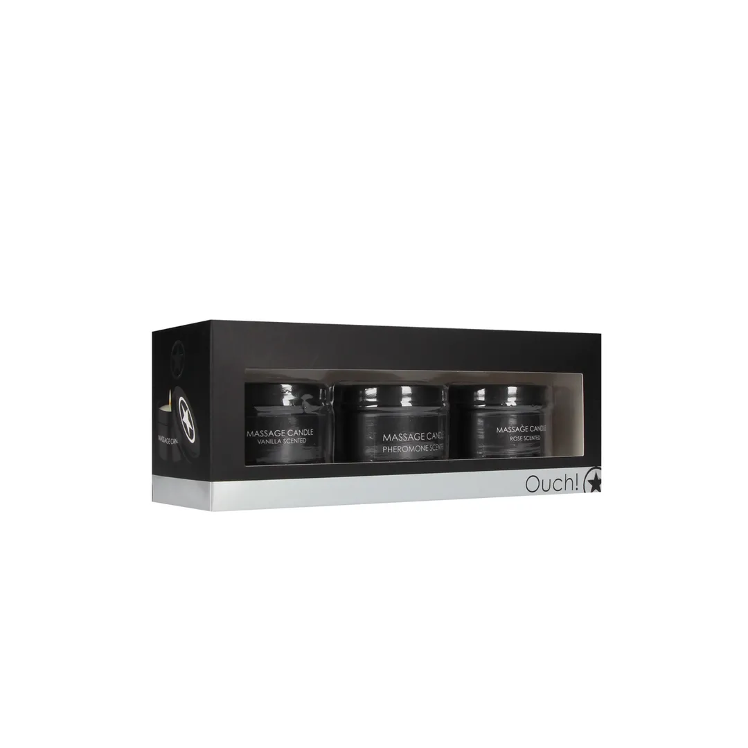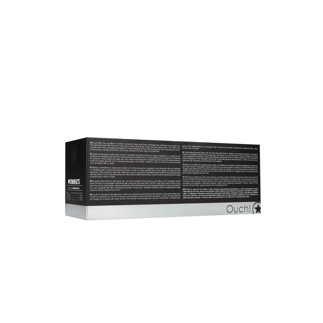 Steek gewoon de kaars aan om een ??sensuele sfeer te creëren en masseer vervolgens je partner naar het paradijs!Terwijl de sensuele geur de kamer vult, zal de warme was zijn magie uitoefenen op de huid van je geliefde.Deze driedubbele waxkaarsenset is het complete pakket om van voorspel tot seksspel te maken!3 sensuele geuren, feromoon, vanille en roos.Beleef ongelooflijke sensaties met dit speeltje van Ouch/