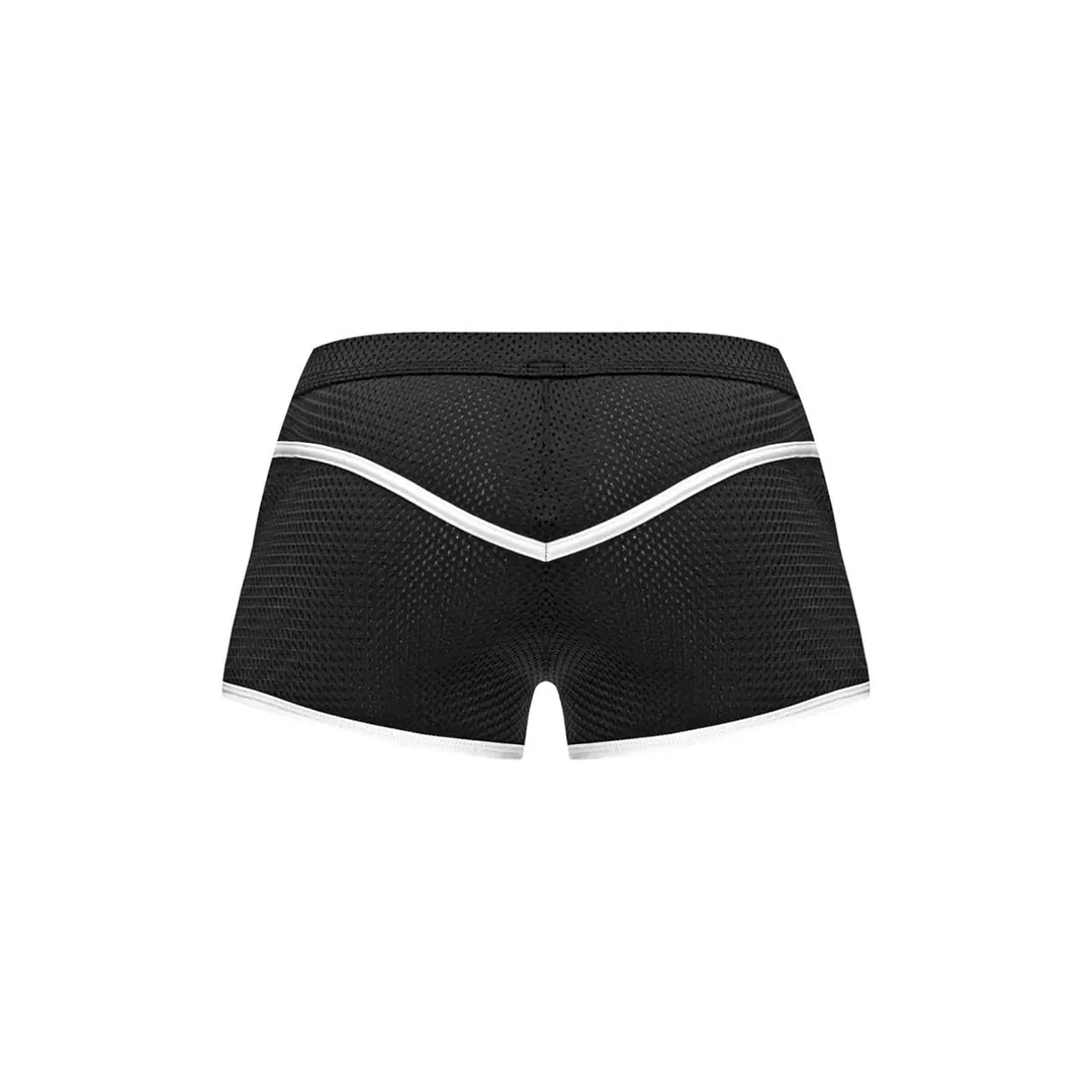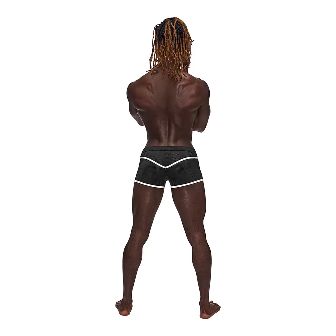 From the Sport Mesh collection by Male Power, the Sport Mini Short, features a stay put fabric covered waistband with a logo'd MP tag. Plush elastane sporty striping highlights the front, rear and legs
