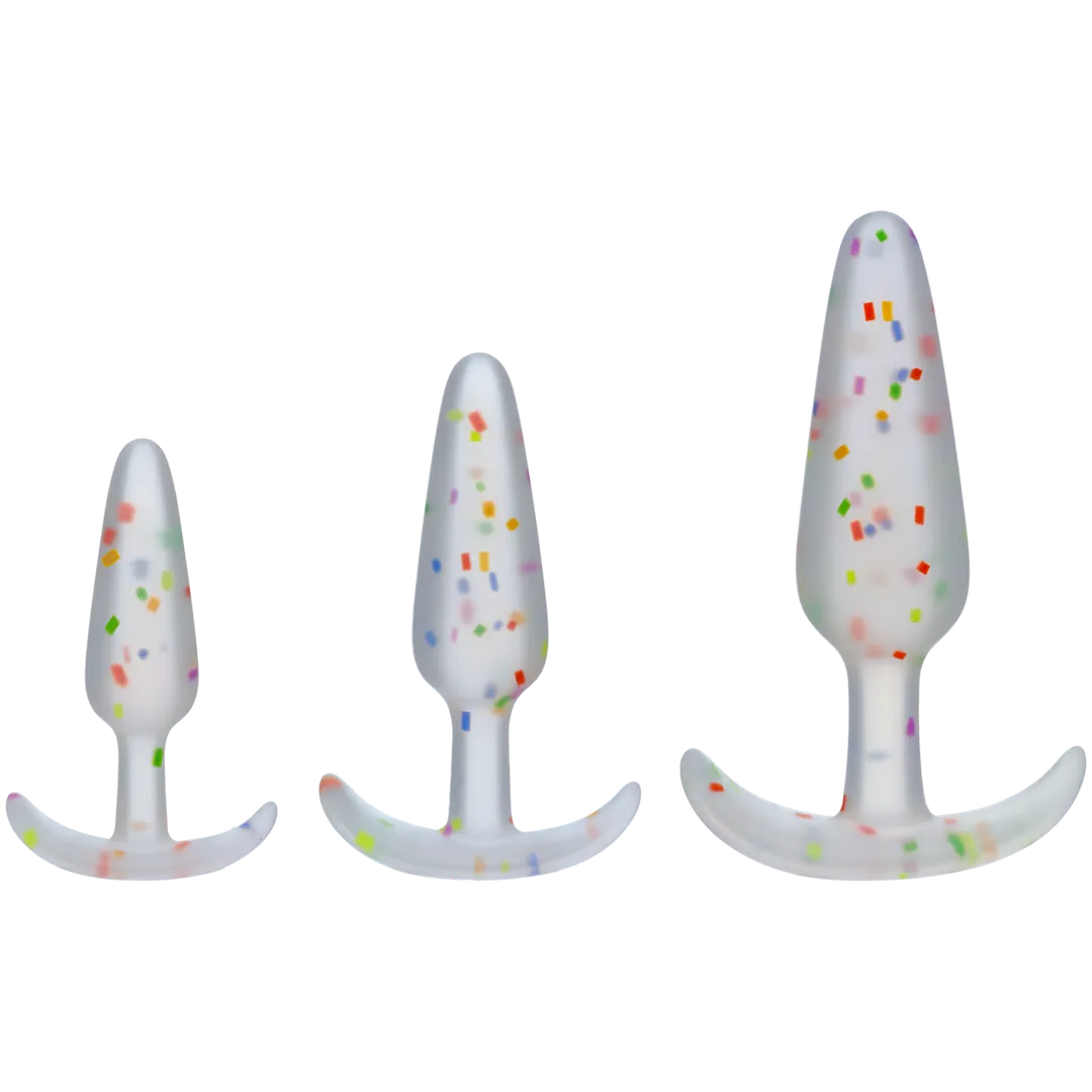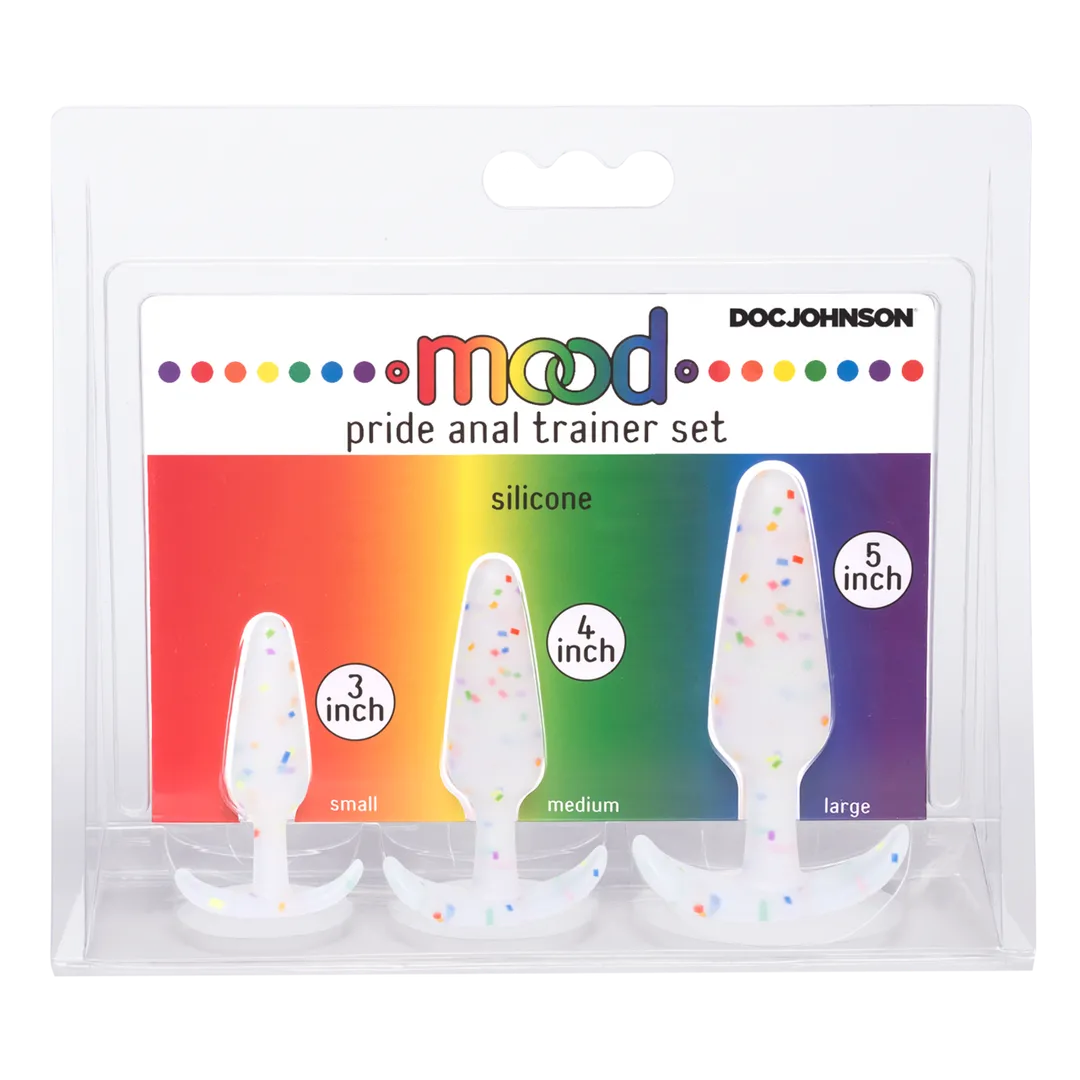 De Mood Naughty 1 Trainer Set van premium silicone is nu verkrijgbaar in regenboogconfetti. Dit pakket bevat de best verkopende Mood Naughty butt plug in drie maten: 3, 4 en 5 inch. Deze kleurrijke set is perfect gevormd en afgestemd om de grenzen van de anale ervaring op een zachte manier te verleggen. De klassieke taps toelopende punt van Mood Naughty glijdt er gemakkelijk in, en het stevige maar flexibele materiaal en de gebogen basis zorgen ervoor dat deze plugs comfortabel en veilig zijn voor langdurig gebruik.