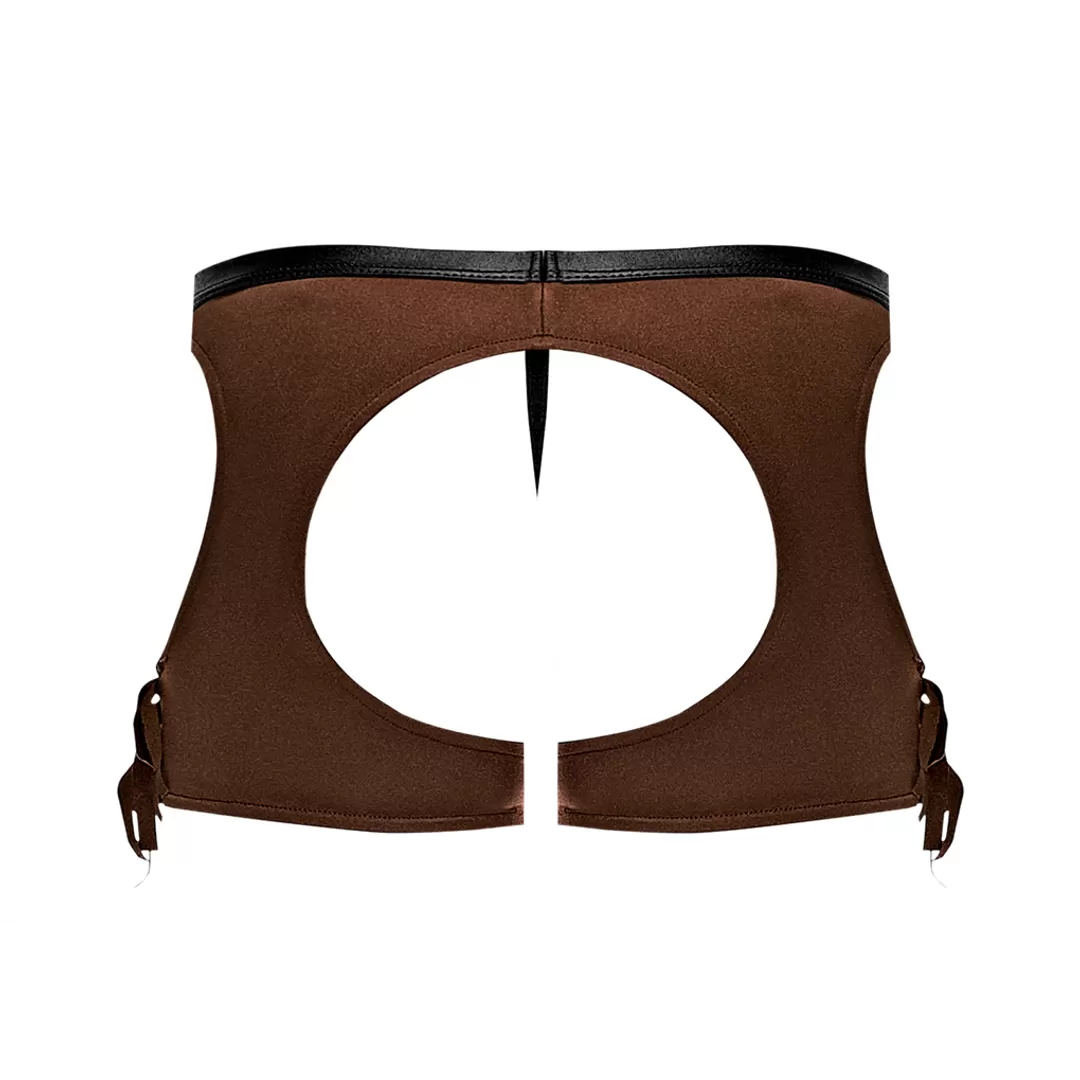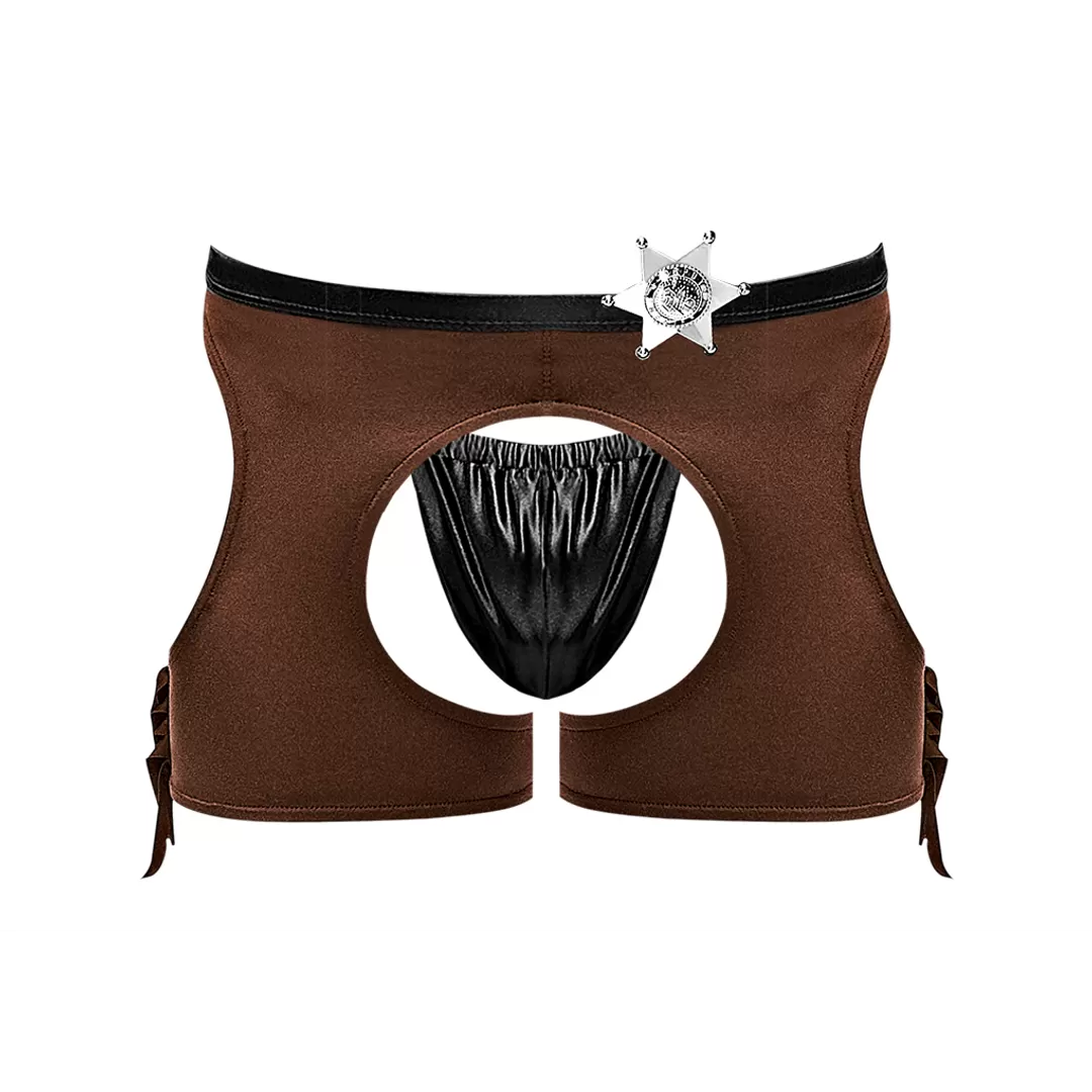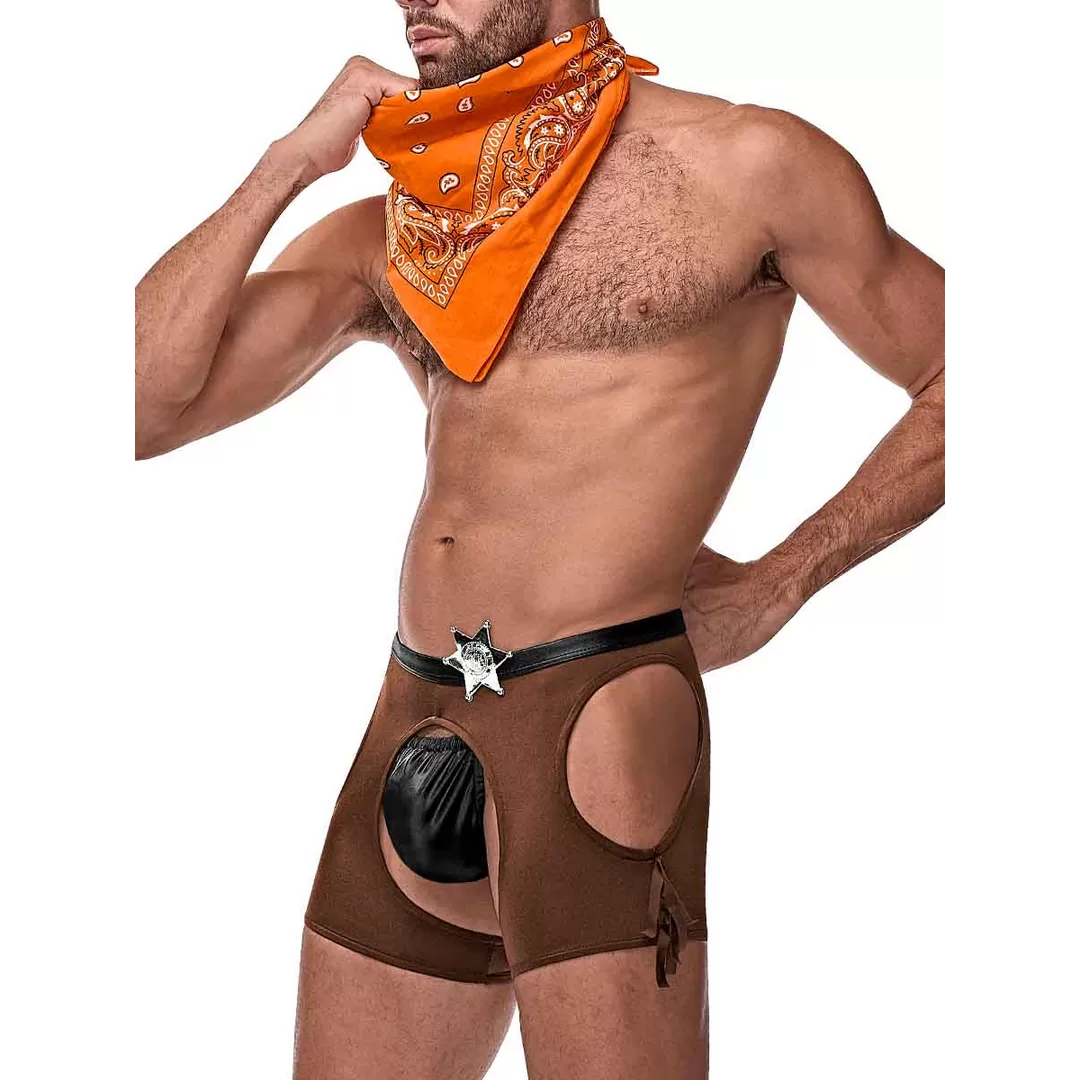 Van de Costumes-collectie van Male Power, deze stijl omvat: Een drie-delige set met een decoratieve bandana, een clip-on badge, korte chaps met cire tailleband, en een poseerstrap met comfortabele pasvorm, elastische tailleband en g-string achterkant.