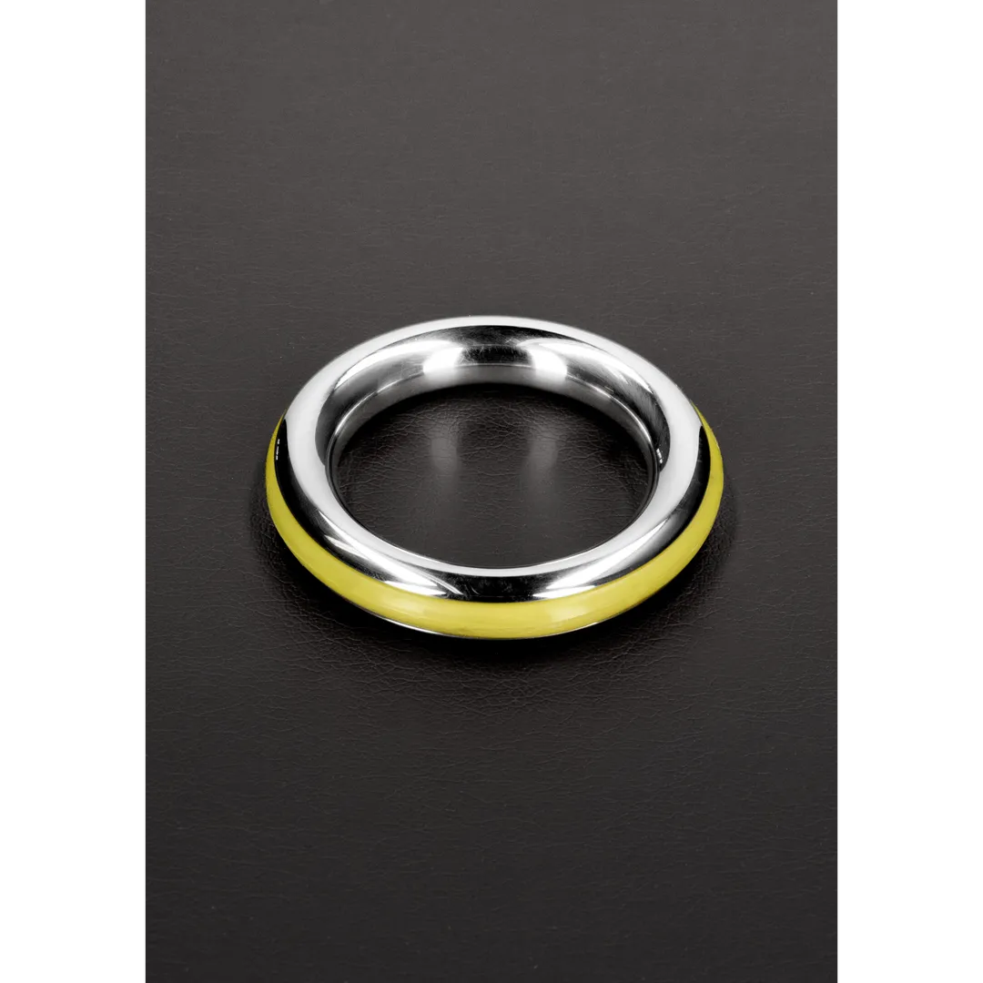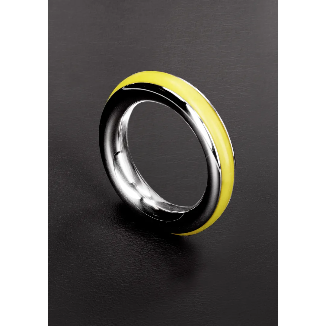 Made from Stainless Steel, this cockring is designed with comfort and style in mind The Cockring has Inlay Silicon Rubber Rings. In the colors: Red, Black, Blue and Yellow. This ring will help prolong your erection and add some flare at the same time.