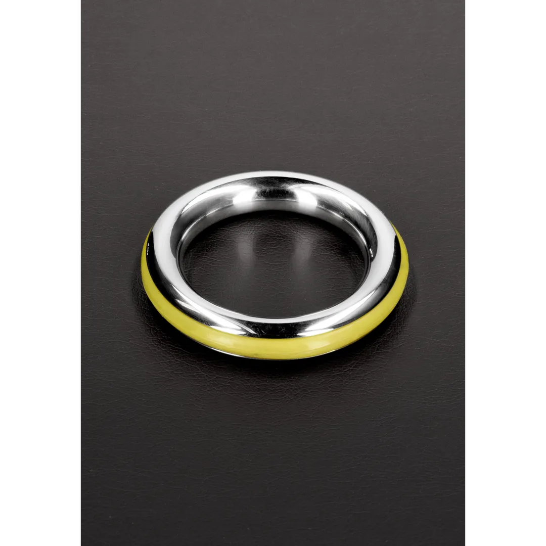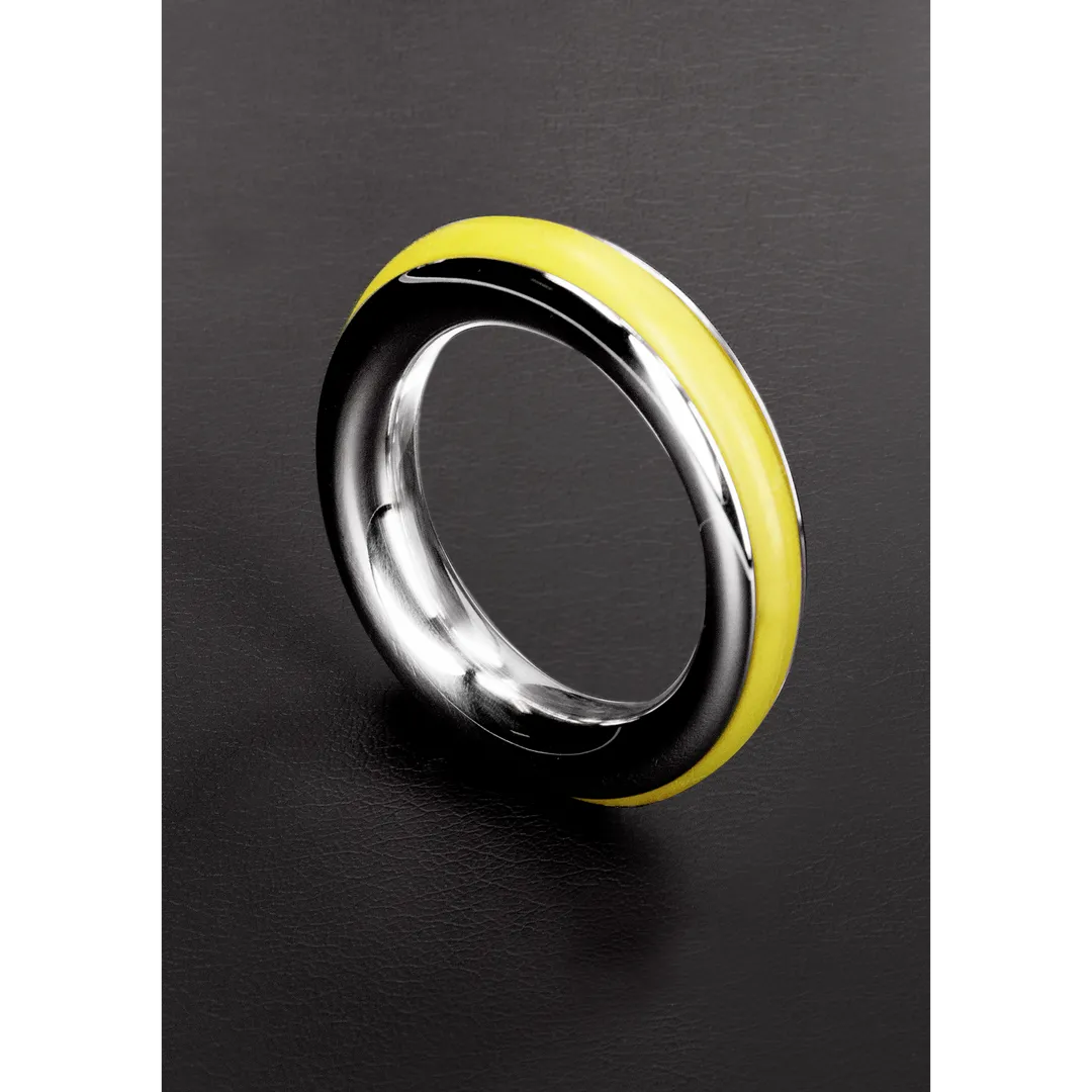 Made from Stainless Steel, this cockring is designed with comfort and style in mind The Cockring has Inlay Silicon Rubber Rings. In the colors: Red, Black, Blue and Yellow. This ring will help prolong your erection and add some flare at the same time.