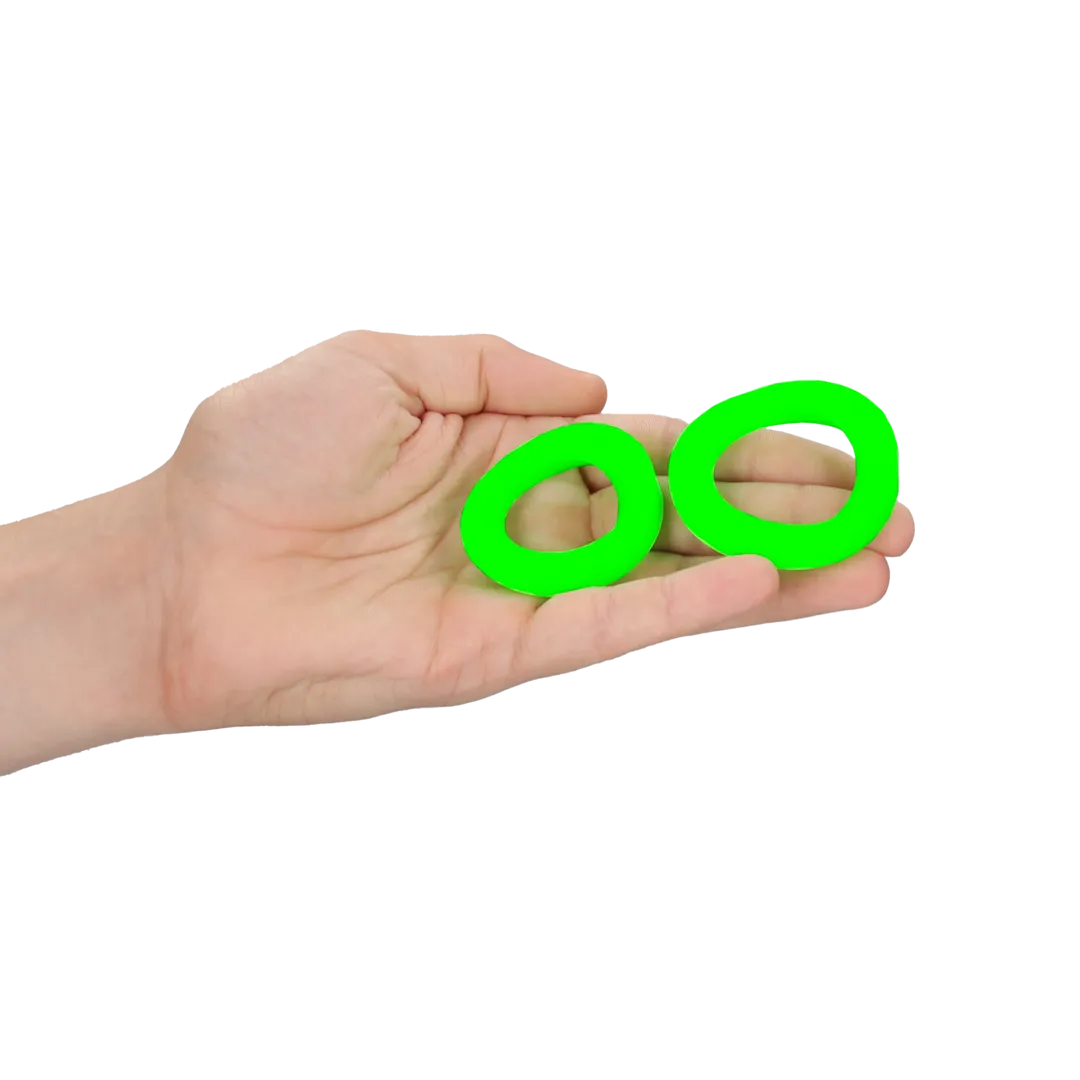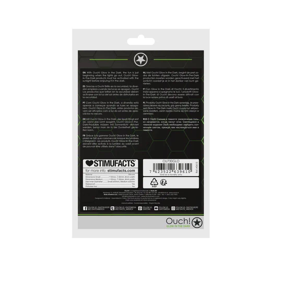 Ouch! Glow in the Dark, the future of bondage is here.This cock ring set contains two sized rings that are comfortable and stretchy.Designed with an authentic bondage aesthetic, but with the added delight of the glow-in-the-dark properties, the fluorescent green detailing will turn every event into a part.Ouch!?Glow-In-The-Dark?products must be activated with the sunlight before enjoying it in the dark.With Ouch! Glow in the Dark, the fun is just beginning when the lights go out./