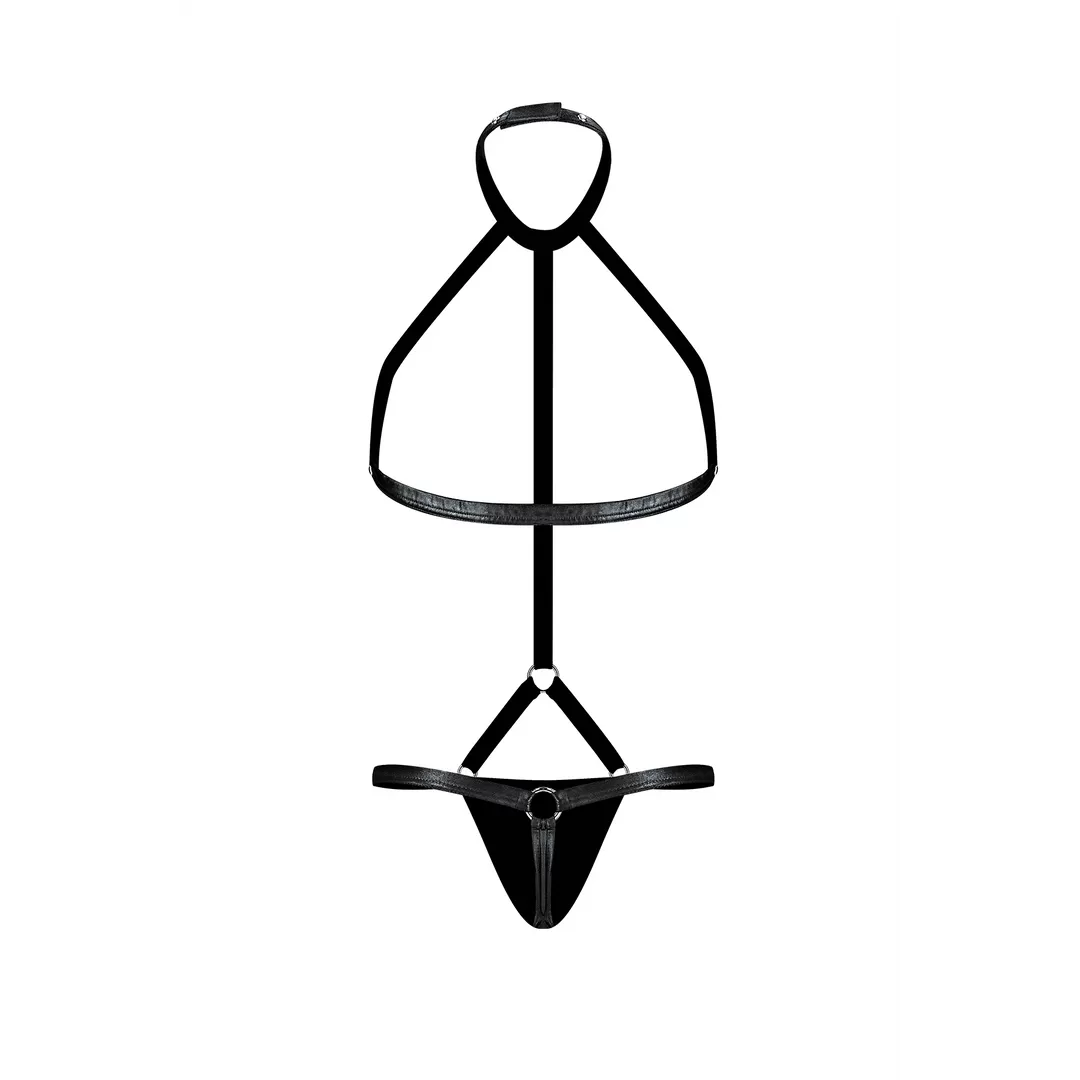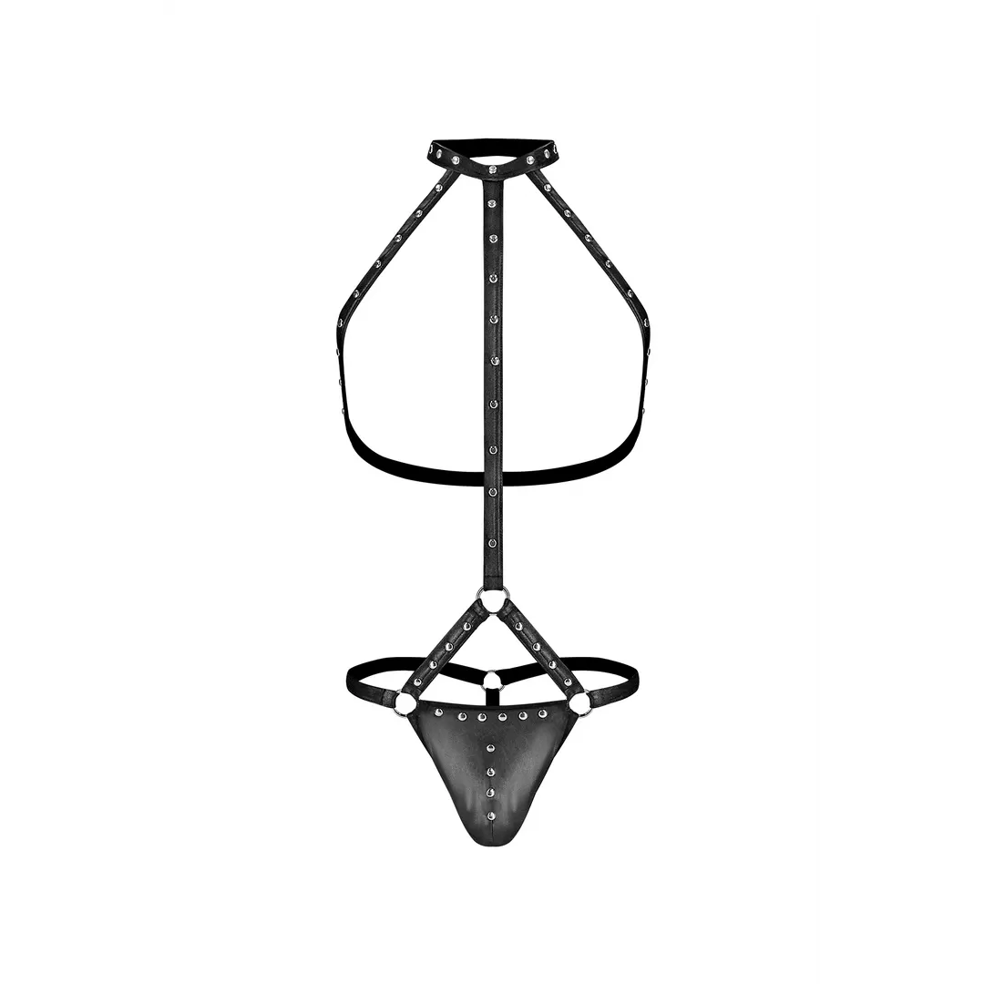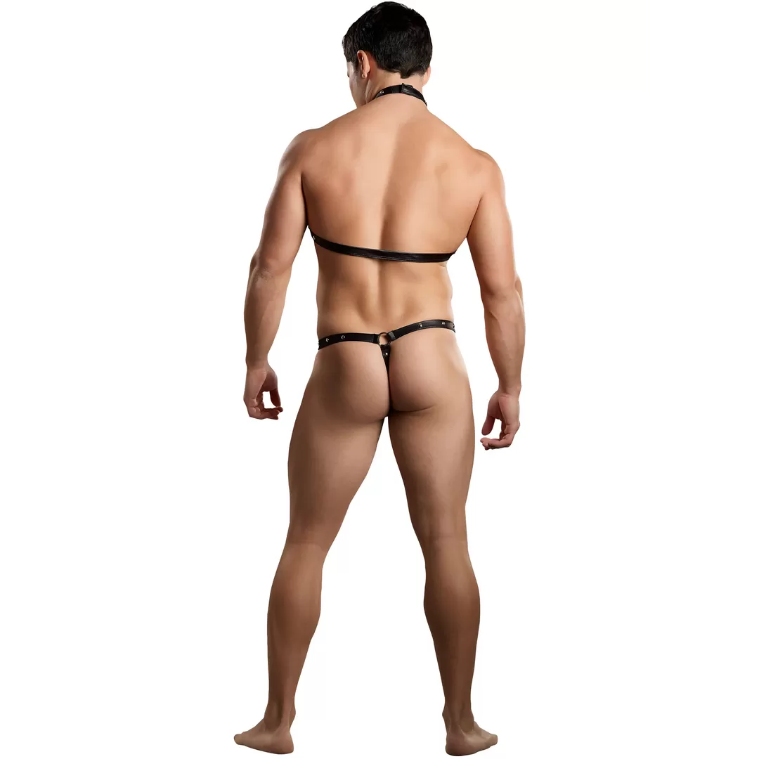 Van de Fetish-collectie van Male Power, deze stijl omvat: Een eendelig thong met een contourzakje, voorzien van een cire tailleband met dubbele ringen bevestigd aan piramidevormige banden die verbinden met een driebanden harnas choker kraag met klittenbandsluiting, micro thong achterkant met ringdetail en decoratieve studs.