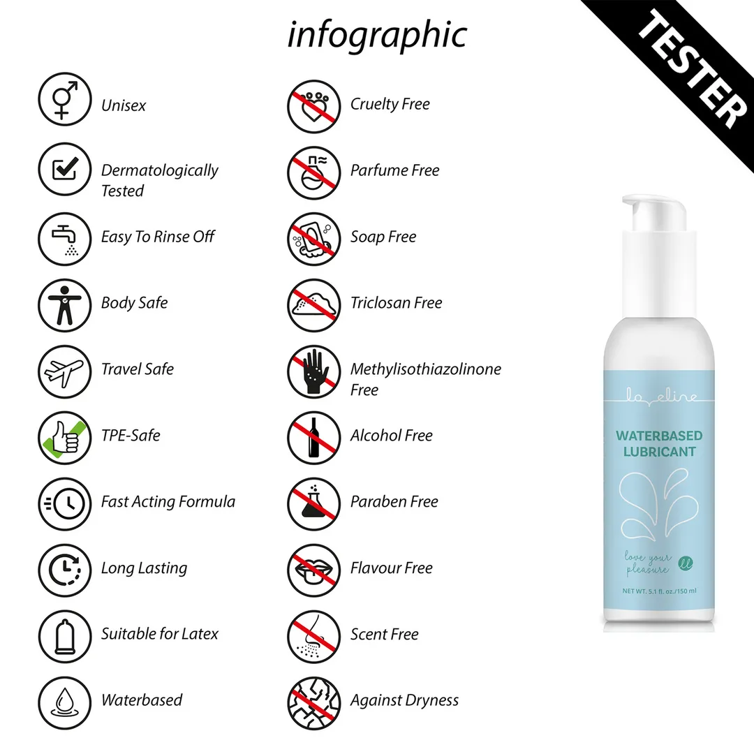 Loveline waterbased lube is een glijmiddel op waterbasis. Geschikt voor gebruik met latex condooms. Dermatologisch getest, vetvrij, kleurloos, geurloos en neutraal van smaak. Gebruiksaanwijzing: Smeer zoveel gel als je wilt op het gewenste lichaamsdeel en herhaal zo vaak je wilt. Buiten het bereik van kleine kinderen bewaren. Koel en donker bewaren.